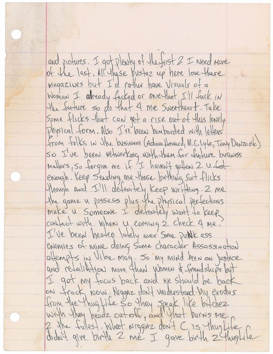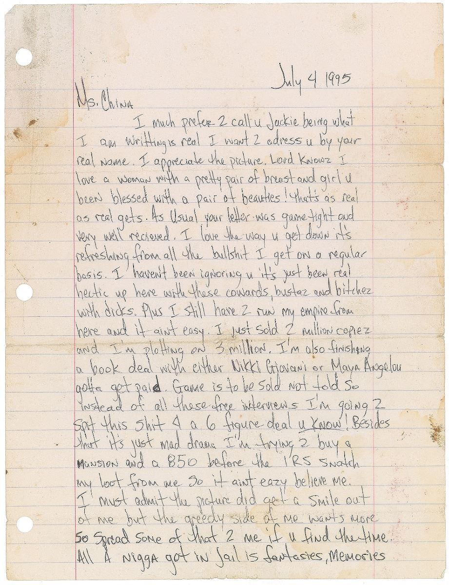 Lengthy ALS signed “Me against the world, 2 Pac,” three pages, lightly-lined, 8 x 10.5, July 4, 1995. Written from New York’s Clayton Correctional facility, a letter to China Thomas, in full (spelling and grammar retained): “I much prefer 2 call u Jackie being what I am writing is real I want 2 adress u by your real name. I appreciate the picture. Lord knowz I love a woman with a pretty pair of breast and girl u been blessed with a pair of beauties! That’s as real as real gets. As usual your letter was game tight and very well received. I love the way u get down it’s refreshing from all the bullshit I get on a regular basis. I haven’t been ignoring u it’s just been real hectic up here with these cowards, bustaz and bitchez with dicks. Plus I still have 2 run my empire from here and it aint easy. I just sold 2 million copiez and I’m plotting on 3 million. I’m also finishing a book deal with either Nikki Giovani or Maya Angelou gotta get paid. Game is to be sold not told so instead of all these free interviews I’m going 2 spit this shit 4 a 6 figure deal u know! Besides that it’s just mad drama I’m trying 2 buy a mansion and a 850 before the IRS snatch my loot from me so it aint easy believe me.