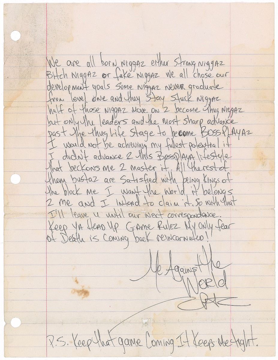 I’ve been heated lately over some punk ass enemies of mine doing some character assassination attempts in Vibe mag. So my mind been on justice and retaliation more than women & friendships but I got my focus back and we should be back on track now. Niggaz don’t understand my exodus from the thug life so they speak like bitchez with they headz cut off, and that burns me 2 the fullest. What niggaz don’t C is thug life didn’t give birth 2 me I gave birth 2 thug life. We are all born niggaz either strong niggaz bitch niggaz or fake niggaz we all chose our development goals some niggaz never graduate from level one and they stay stuck niggaz but only the leaders and the most sharp advance past the thug life stage to become Boss Playaz I would not be achieving my fullest potential if I didn’t advance 2 this Boss Playa lifestyle that beckons me 2 master it. All the rest of them bustaz are satisfied with being kings of the block me I want the world it belongs 2 me and I intend to claim it. So with that I’ll leave you until our next correspondence. Keep ya head up game rulez my only fear of death is coming back reincarnated!” Shakur adds a brief postscript, “Keep that game coming It keeps me tight.” Includes the original mailing envelope, addressed in Shakur’s own hand. In very good condition, with the envelope in good condition. The original recipient of this letter wrote Tupac to thank him for his song, ‘Keep Your Head Up,’ which helped her through a rough time in her life.
