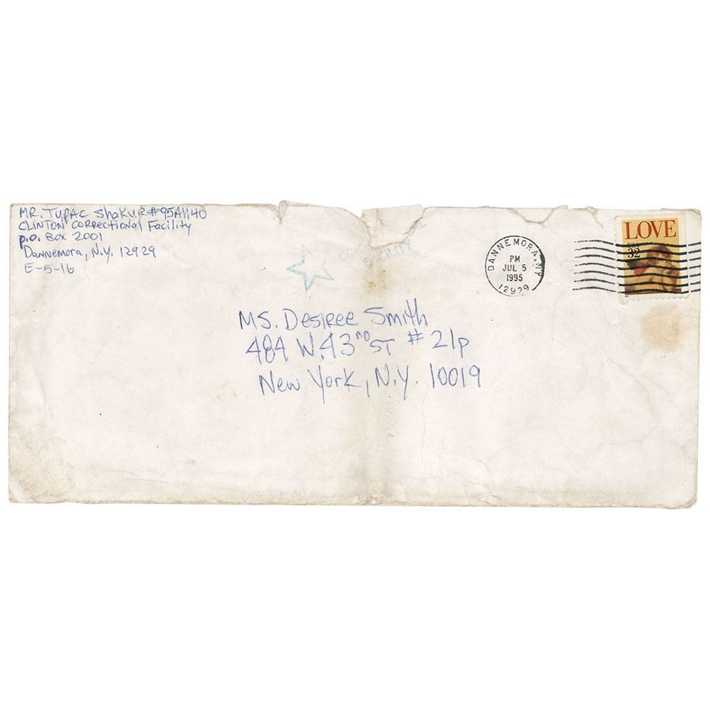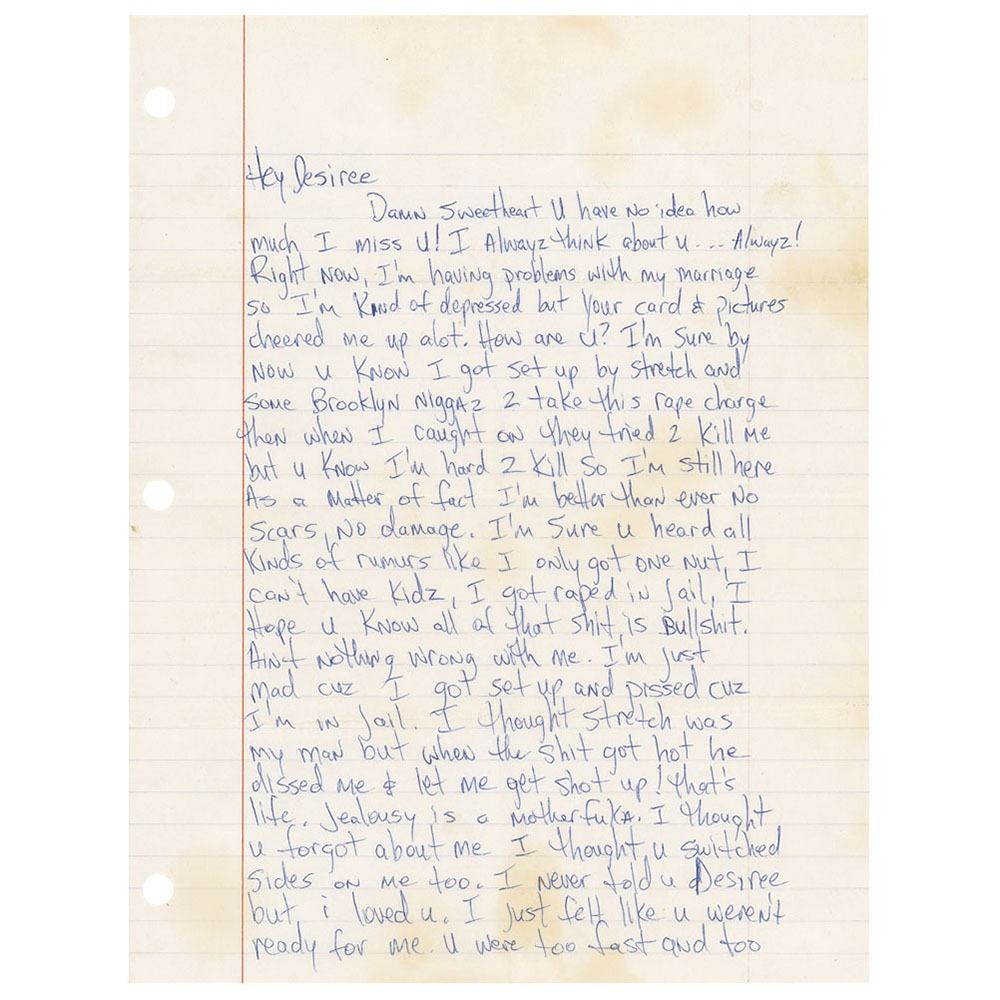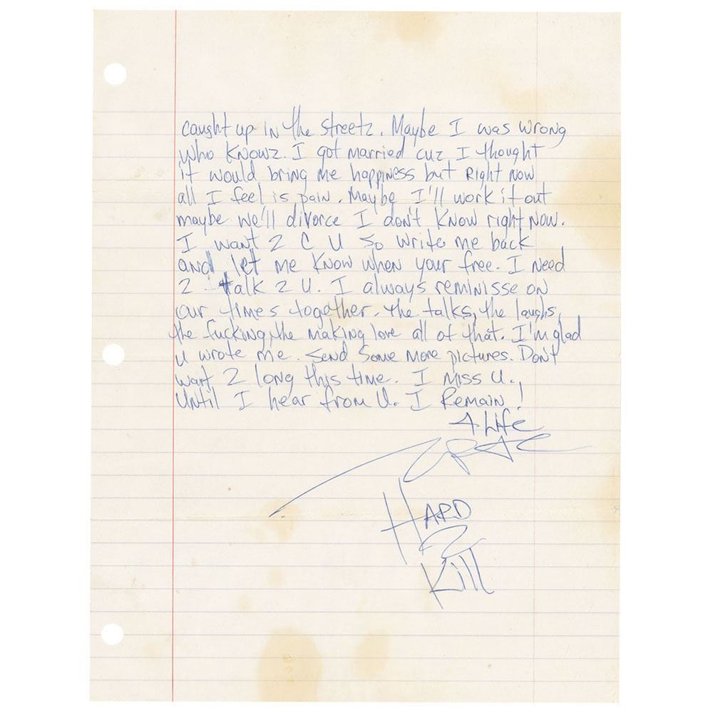 Rare ALS signed “2Pac, Hard 2 Kill,†two pages, 8 x 10.5, postmarked July 5, 1995, addressed to his friend “Ms. Desiree Smith,†written while incarcerated in the Clinton Correctional Facility in New York. The handwritten letter, in full: “Damn sweetheart u have no idea how much I miss u! I alwayz think about u…Alwayz! Right now, I’m having problems with my marriage so I’m kind of depressed but your card & pictures cheered me up a lot. How are u? I’m sure by now u know I got set up by Stretch and some Brooklyn niggaz 2 take this rape charge then when I caught on they tried 2 kill me but u know I’m hard 2 kill so I’m still here, as a matter of fact I’m better than ever no scars, no damage. I’m sure u heard all kinds of rumurs like I only got one nut, I can’t have kidz, I got raped in jail, I hope u know all of that shit is bullshit. Ain’t nothing wrong with me. I’m just mad cuz I got set up and pissed cuz I’m in jail. I thought Stretch was my man but when the shit got hot he dissed me & let me get shot up! That’s life. Jealousy is a motherfuka. I thought u forgot about me I thought u switched sides on me too. I never told u Desiree but I loved u. I just felt like u weren’t ready for me. U were too fast and too caught up in the streetz. Maybe I was wrong who knowz. I got married cuz I thought it would bring me happiness but right now all I feel is pain. Maybe I’ll work it out maybe we’ll divorce I don’t know right now. I want 2 c u so write me back and let me know when your free. I need 2 talk 2 u. I always reminisse on our times together, the talks, the laughs, the fucking, the making love all of that. I’m glad u wrote me. Send some more pictures. Don’t wait 2 long this time. I miss u. Until I hear from u. I remain! 4 life. 2Pac. Hard 2 kill.†In very good to fine condition, with creasing and light staining. Accompanied by the original mailing envelope addressed in Shakur's hand, incorporating his full name, "Tupac Shakur," in the return address area.