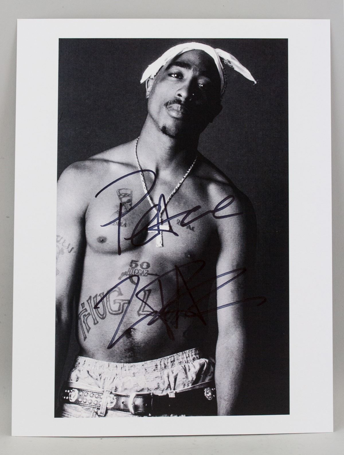 An autographed photograph. Signed Tupiac Shakur. 28 x 21.5 cm (11 x 8.5 in). Accompanied with JSA Letter of authenticity. Tupac Amaru Shakur (1971-1996), also known by his stage names 2Pac and Makaveli, was an American rapper and actor. He is considered by many to be one of the greatest rappers of all time.