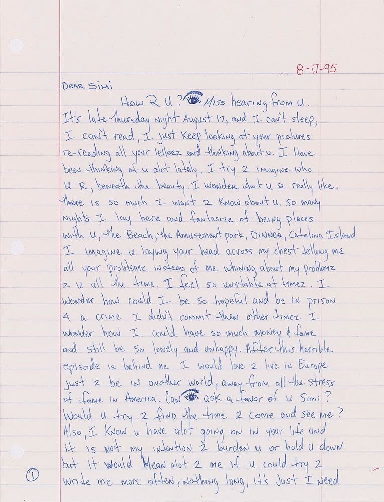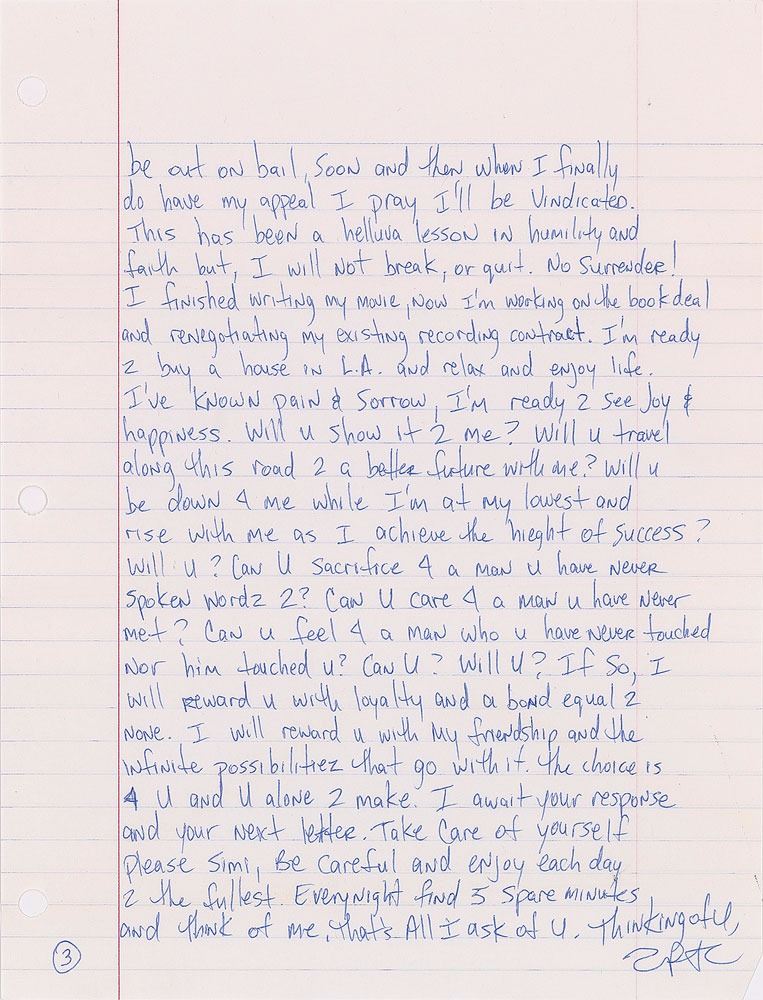 ALS signed “2Pac,” three pages, lightly lined, 8 x 10.5, August 17, 1995. Letter to Simi Chouhan, written while incarcerated in the Clinton Correctional Facility in New York, in full: "How R U? [Eye] Miss hearing from u. It's late Thursday night August 17, and I can't sleep, I can't read, I just keep looking at your pictures re-reading all of your letterz and thinking about u. I Have been thinking of u alot lately. I try 2 imagine who u r, beneath the beauty. I wonder what u r really like. There is so much I want 2 know about u. So many nights I lay here and fantasize of being places with u, the Beach, the Amusement park, Dinner, Catalina Island. I imagine u laying your head across my chest telling me all your problemz instead of me whining about my problemz 2 u all the time. I feel so unstable at timez. I wonder how could I be so hopeful and be in prison 4 a crime I didn't commit then other timez I wonder how I could have so much money & fame and still be so lonely and unhappy. After this horrible episode is behind me I would love 2 live in Europe just 2 be in another world, away from all the stress of fame in America. Can [eye] ask a favor of u Simi? Would u try 2 find the time 2 come and see me? Also, I know u have alot going on in your life and it is not my intention 2 burden u or hold u down but it would Mean alot 2 me if u could try 2 write me more often, nothing long, it's just I need 2 hear from u, I need my friend [smiley face]. Did that sound desperate or what? I hope not. I don't want 2 take up all of your time but I'm going through this divorce and u alwayz cheer me up and your pictures bring sunshine 2 this dark place.
