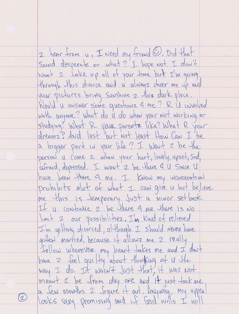 Would u answer some questionz 4 me? R u involved with anyone? What do u do when your not working or studying? What R your parentz like? What R your dreamz? And last but not least How Can I be a bigger part in your life? I want 2 be the person u come 2 when your hurt, lonely upset, sad, afraid, depressed. I want 2 be there 4 u since u have been there 4 me. I know my incarceration prohibits alot of what I can give u but believe me this is temporary, just a minor setback. If u continue 2 be there 4 me there is no limit 2 our possibilitiez. I'm kind of relieved I'm getting divorced, although I never should have gotten married, because it allowz me 2 really follow wherever my heart takes me and I don't have 2 feel guilty about thinking of u the way I do. It wasn't just that, it was not meant 2 be from day one and it just took me a few months 2 figure it out. Anyway, my appeal looks very promising and if God wills I will be out on bail, soon and then when I finally do have my appeal I pray I'll be vindicated. This has been a helluva lesson in humility and faith but, I will not break, or quit. No surrender!