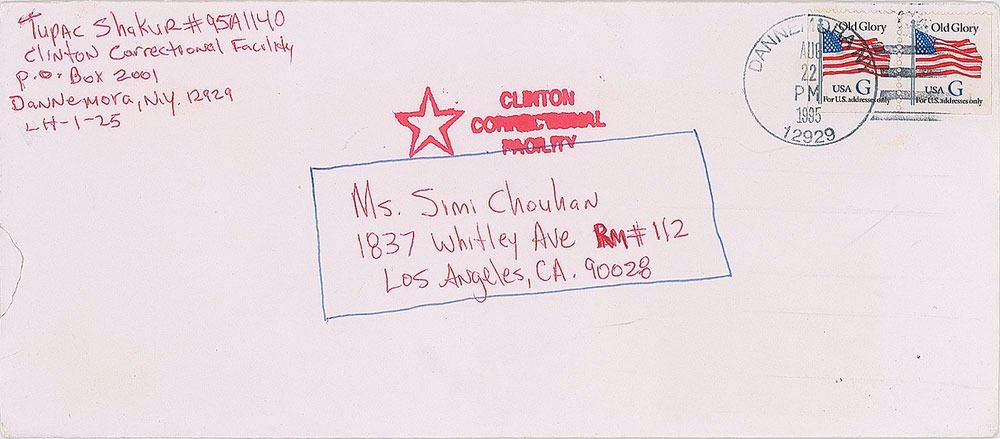 I finished writing my movie, now I'm working on the book deal and renegotiating my existing recording contract. I'm ready 2 buy a house in L. A. and relax and enjoy life. I've known pain & sorrow, I'm ready 2 see Joy & happiness. Will u show it 2 me? Will u travel along this road 2 a better future with me? Will u be down 4 me while I'm at my lowest and rise with me as I achieve the hieght [sic] of success? Will u? Can u sacrifice 4 a man u have never spoken wordz 2? Can u care 4 a man u have never met? Can u feel 4 a man who u have never touched nor him touched u? Can u? Will u? If so, I will reward u with loyalty and a bond equal 2 none. I will reward u with my friendship and the infinite possibilitiez that go with it. The choice is 4 u and u alone 2 make. I await your response and your next letter. Take care of yourself. Please Simi, be careful and enjoy each day 2 the fullest. Every night find 5 spare minutes and think of me. That's all I ask of u." In fine condition. Accompanied by the original mailing envelope addressed in Shakur's hand, incorporating his full name, "Tupac Shakur," in the return address area.
