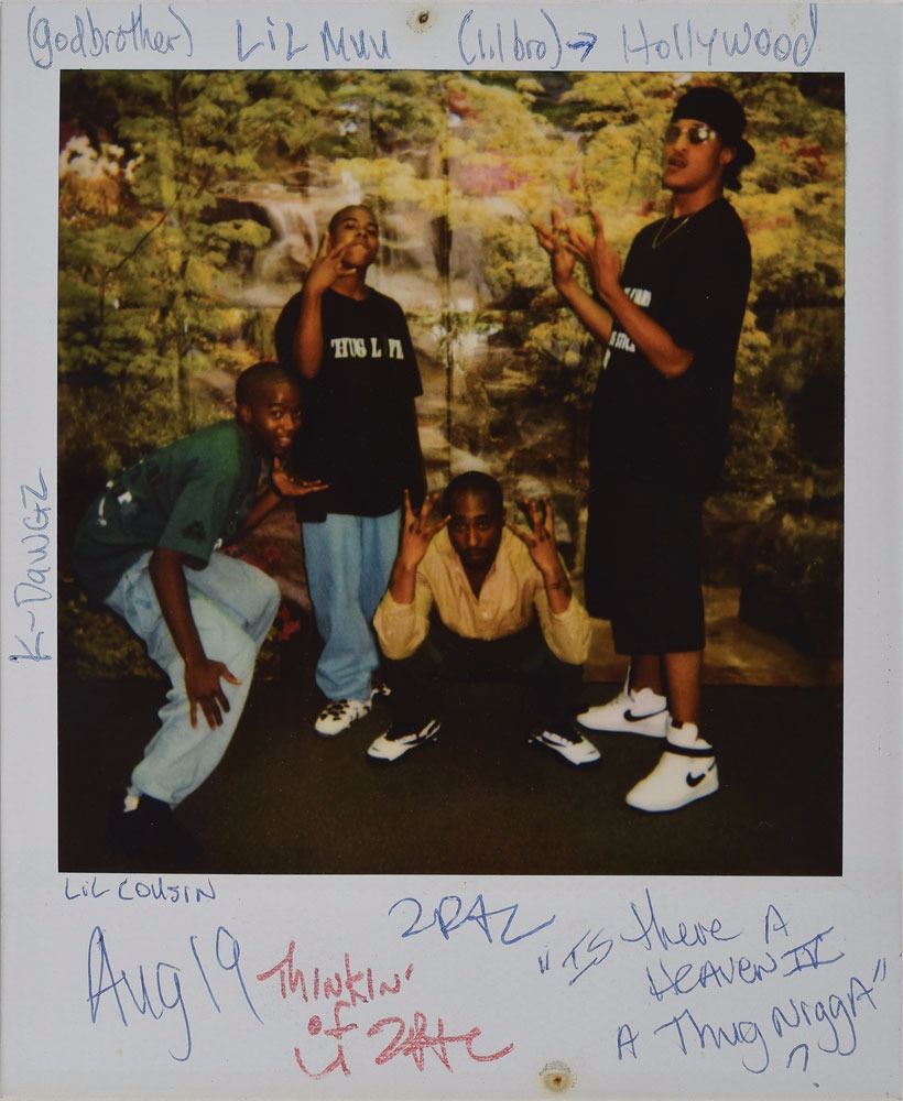 Extremely rare color glossy 3.5 x 4.25 Polaroid photo of Tupac Shakur in a full-length pose with three members of the Outlawz crew, signed in the lower border in black ballpoint, "2Pac," and again in red ink, "Thinkin' of U, 2Pac." In the white borders Shakur dates the photograph, "Aug 19," and identifies the three other members: "Lil cousin, K–Dawgz," "(Godbrother) Lil Muu," and "(lil bro) Hollywood." Shakur adds to the lower right, "'Is there a Heaven IV a Thug nigga?'" In fine condition, with two pinholes to top and bottom edges. Consignor notes that this photo was sent to Simi Chouhan, a woman Shakur corresponded with while he was incarcerated in New York's Clinton Correctional Facility on a sexual assault charge. His album Me Against the World was released in March 1995, a month into his sentence, and made an immediate impact on the charts, debuting at number one on the Billboard 200. Tupac's confinement proved an important period in his artistic development as he took the time to read philosophical works including many by Niccolo Machiavelli, which inspired his pseudonym 'Makaveli.' A significant portrait of Shakur and the Outlawz, signed less than two months before his release from the Clinton Correctional Facility on October 12, 1995.