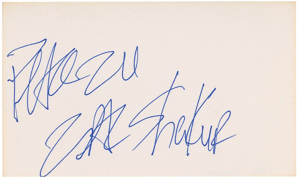 Rapper and actor (1971–1996) who was gunned down in Las Vegas by unknown assailants. Scarce in-person ink signature, “Peace 2 U 2pac Shakur,” on an off-white 5 x 3 card. In very fine condition. Accompanied by a full letter of authenticity from PSA/DNA.