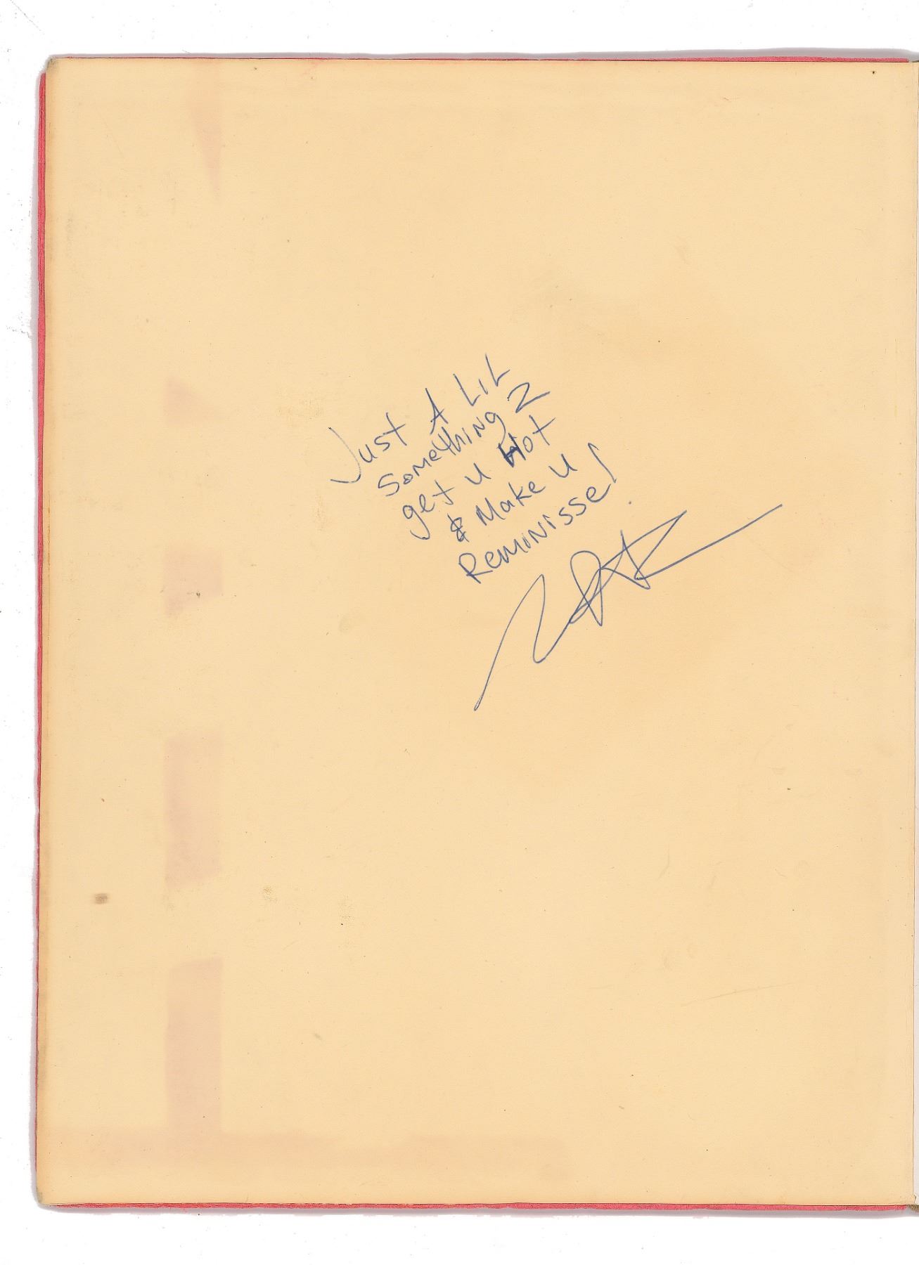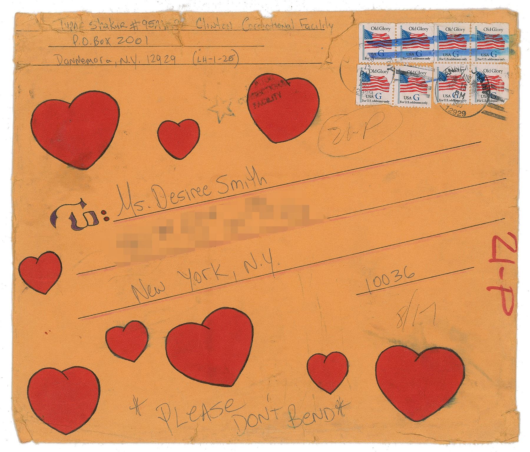 Handcrafted card with original hand-drawn artwork made by Tupac Shakur while incarcerated at the Clinton Correctional Facility in New York and sent to his friend Desiree Smith. The card measures 8.5 x 11 closed, and features a number of foam hearts affixed to the front, with a purple "I Love You" foil appliqué and handwritten inscription, "To 'Desiree,' And Daddy is…," with the artwork inside continuing, "…Missing you deeply!" Inside, Tupac fills the page with a detailed, graphic drawing of himself during an intimate moment with Desiree (the explicit image available upon request). Inside the cover, he writes: "Just a lil something 2 get u hot & make u reminisse! 2Pac." Includes the original mailing envelope, addressed in Shakur's hand to Smith, and signed in the return address area: "Tupac Shakur #95A, Clinton Correctional Facility, P.O. Box 2001, Dannemora, N.Y. 12929." The back of the envelope is marked: "Fragile, Please Don't Bend, Thank U!" In fine condition, with a few edge tears and creases to the envelope. Accompanied by a full letter of authenticity from JSA.