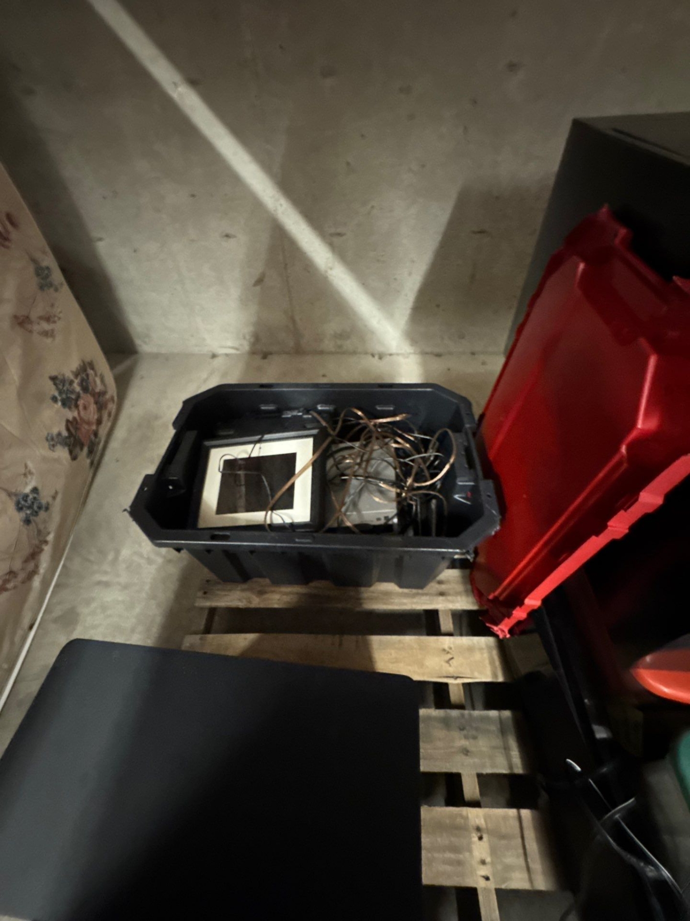 Tupperware container full of miscellaneous electronics, wiring for speakers, various items.