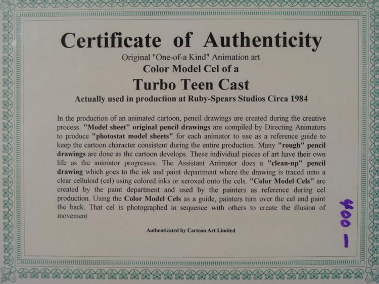 Here is an original animation model cel used in the production of the 1984 Ruby-Spears cartoon Turbo Teen. This cel was used as a reference for animators, and it has the entire cast of the show, including that red hot sports car that the teen would transform into. The show only had 12 episodes, making this cel a rare find of 1980's animation. * Medium: Hand-inked and hand-painted acetate celImage size: 11 x 8 1/2 inches Presentation: Double matted in blue and whiteMatte size: 16 x 12 inchesDetails: 1984 Ruby-Spears copyright, lower leftCondition: Excellent