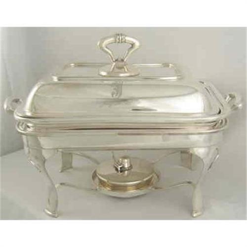 A beautiful Tureen in amazing condition. Made by Reed and Barton of silver soldered silver plate. The lid has a removable handle and is inscribed, "F" July 29th 1910. The "F" is in old English script. There is a middle tray and bottom vented tray to hold the hot water. There is a burner/heater with a removable screw top and a fat wick inside for use with sterno. The burner has an extinguishing cap. The whole piece weighs a whopping 11.1/2lbs!! There are very slight wear scratches overall but quite frankly this item has never been used!