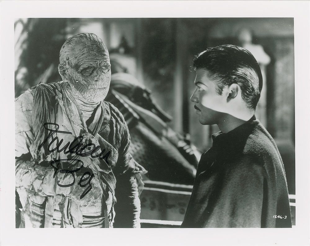 Glossy 10 x 8 double-weight photo of Bey and Lon Chaney, Jr. from 1942’s The Mummy’s Tomb, signed in black felt tip. In fine condition.