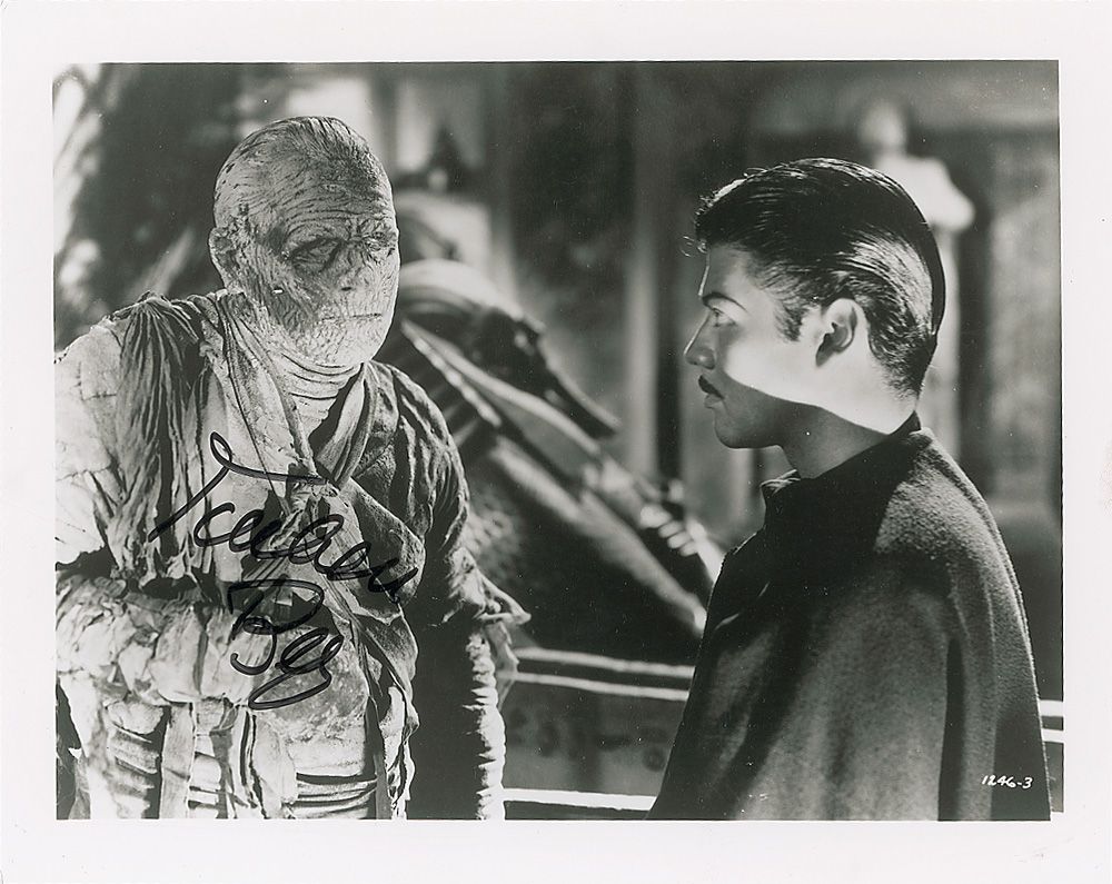 Glossy 10 x 8 photo of Bey and Lon Chaney, Jr. from 1942’s The Mummy’s Tomb, signed in black felt tip by Bey. In fine condition.