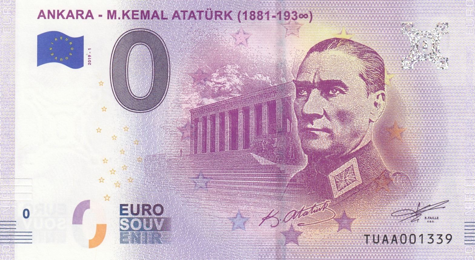 Turkey, 0 Euro, 2019, UNC, FANTASY BANKNOTE, Atatürkbr/Republic of Turkey's founder Mustafa Kemal Ataturk's memory of fancy printed banknot, serial number: TUAA 001339