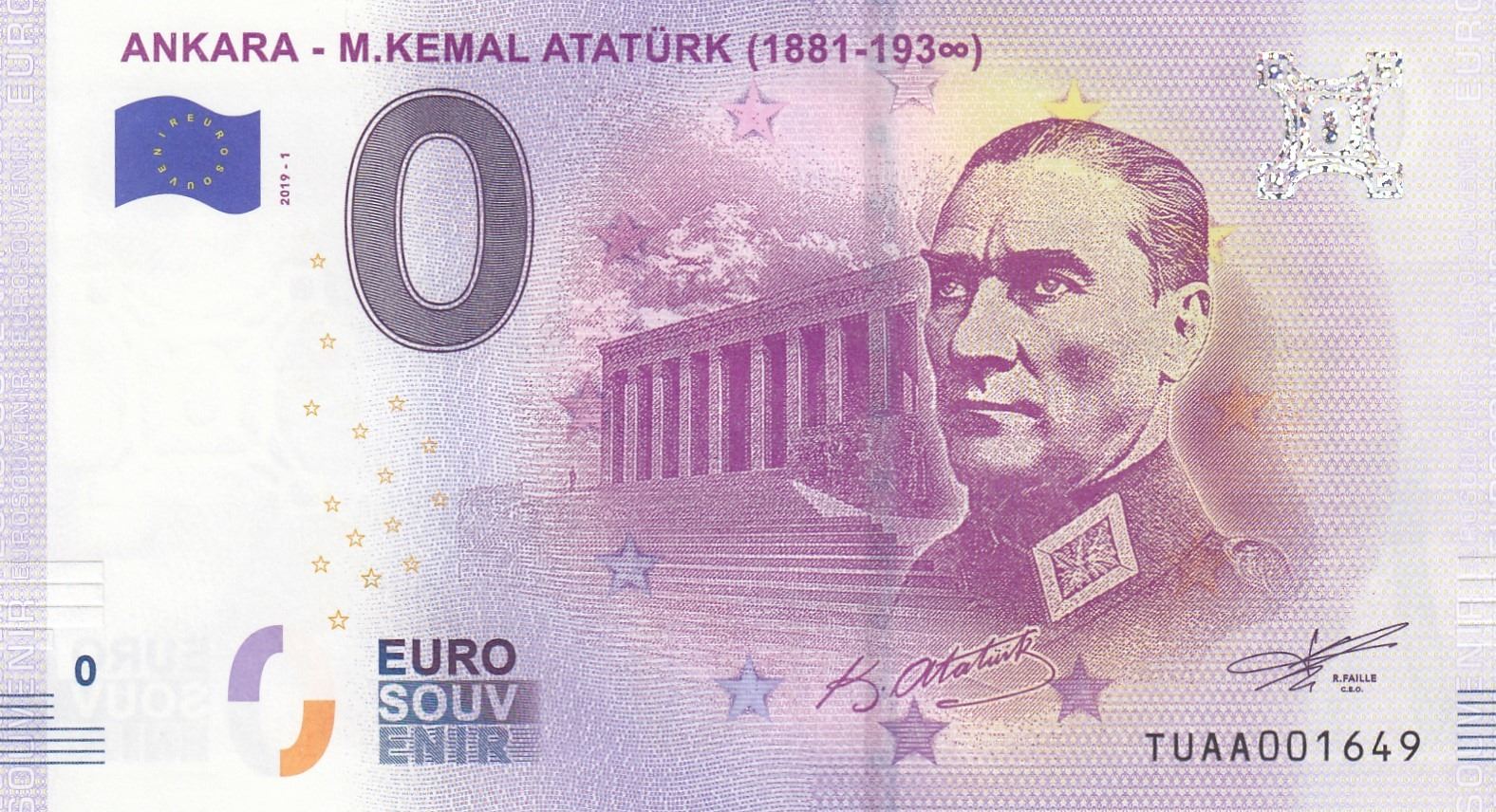 Turkey, 0 Euro, 2019, UNC, FANTASY BANKNOTE, Atatürkbr/Republic of Turkey's founder Mustafa Kemal Ataturk's memory of fancy printed banknot, serial number: TUAA 001649