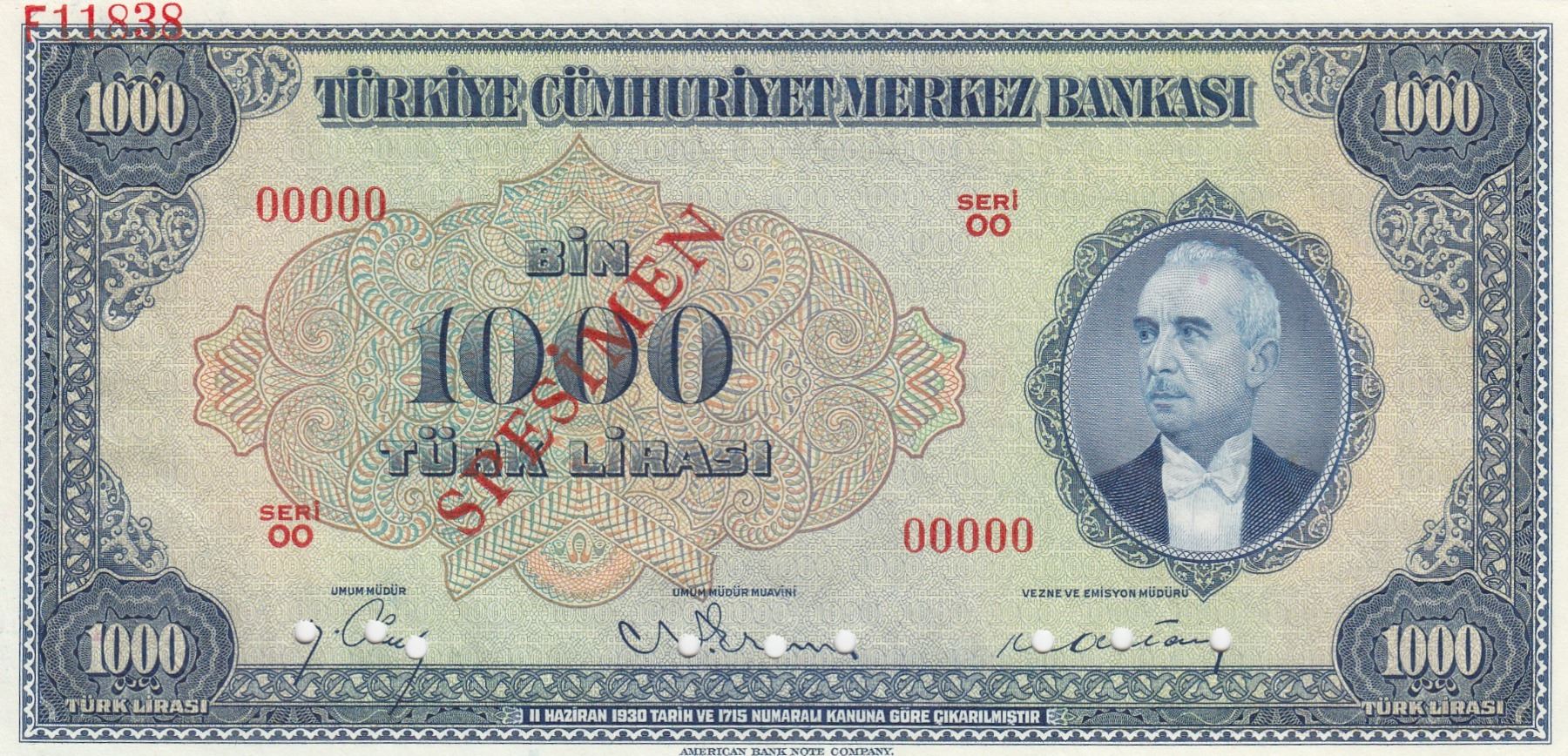 Turkey, 1.000 Lira, 1946, UNC, 3/1. Emission, p146, SPECIMENbr/Inönü portrait, serial number: 00000