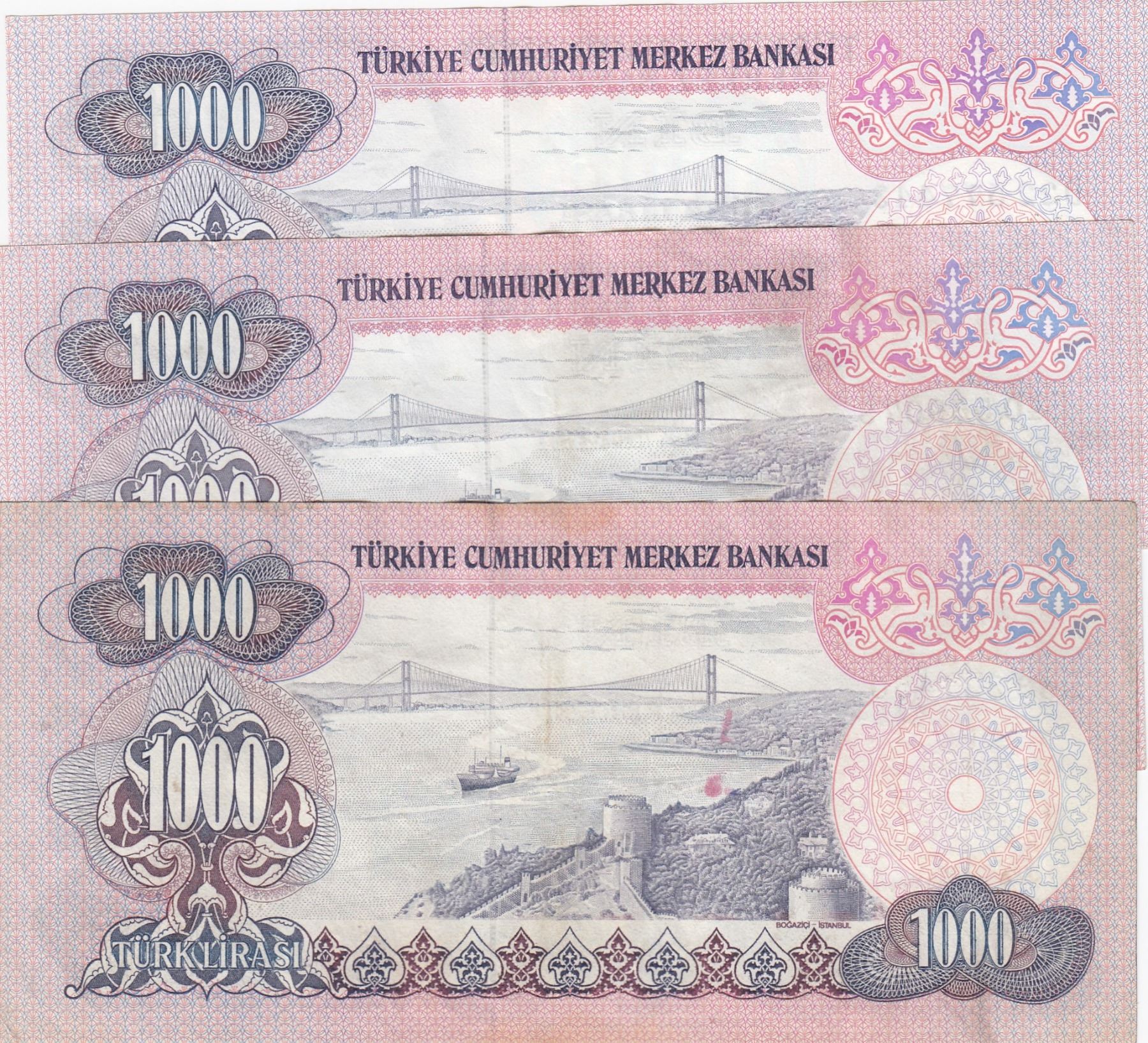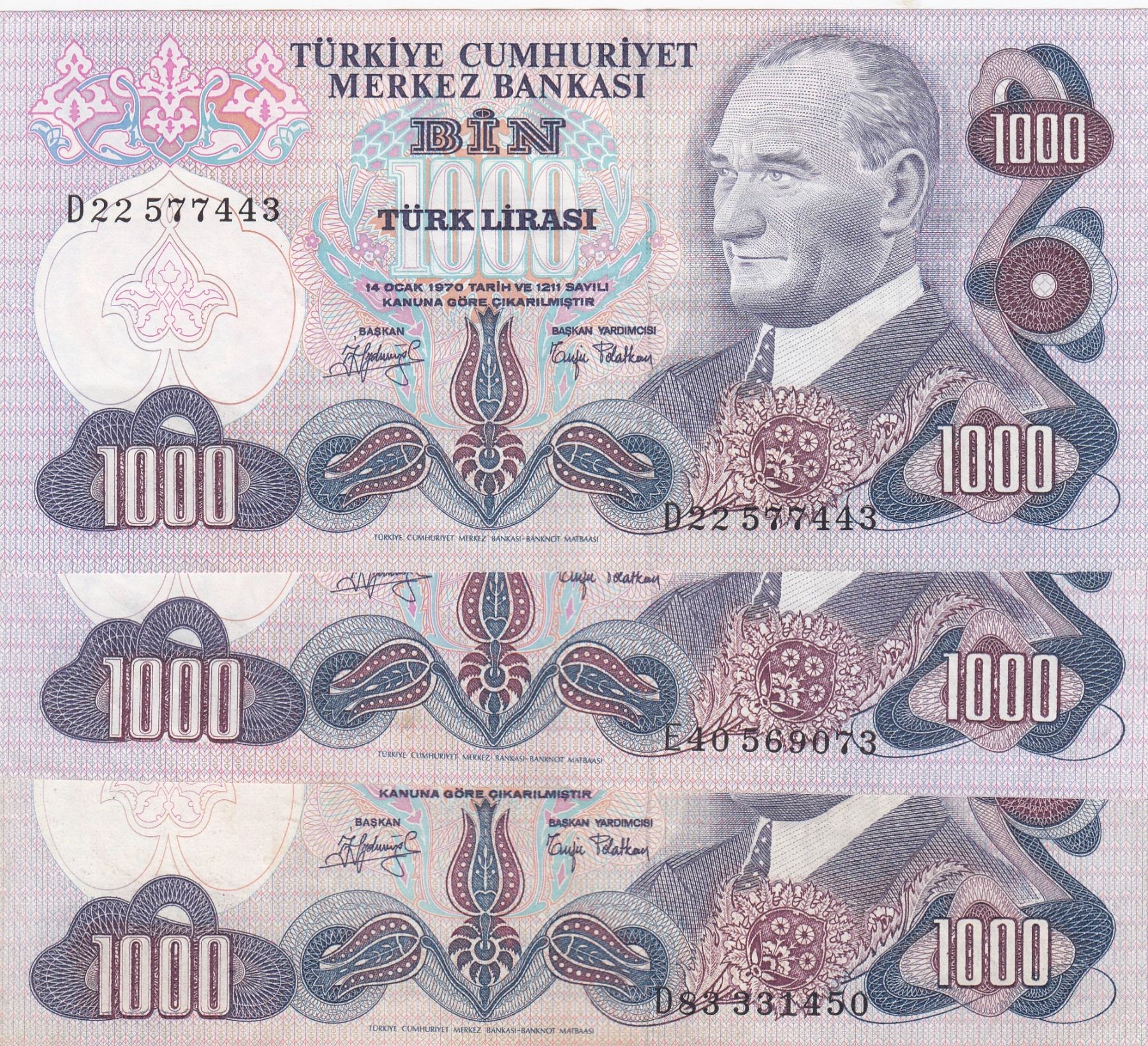 Turkey, 1.000 Lira, 1979, VF/XF, 6/2. Emission, p191, (Total 3 banknotes)br/Atatürk portrait, serial numbers: D22 577443, D83 331450 and E40 569073