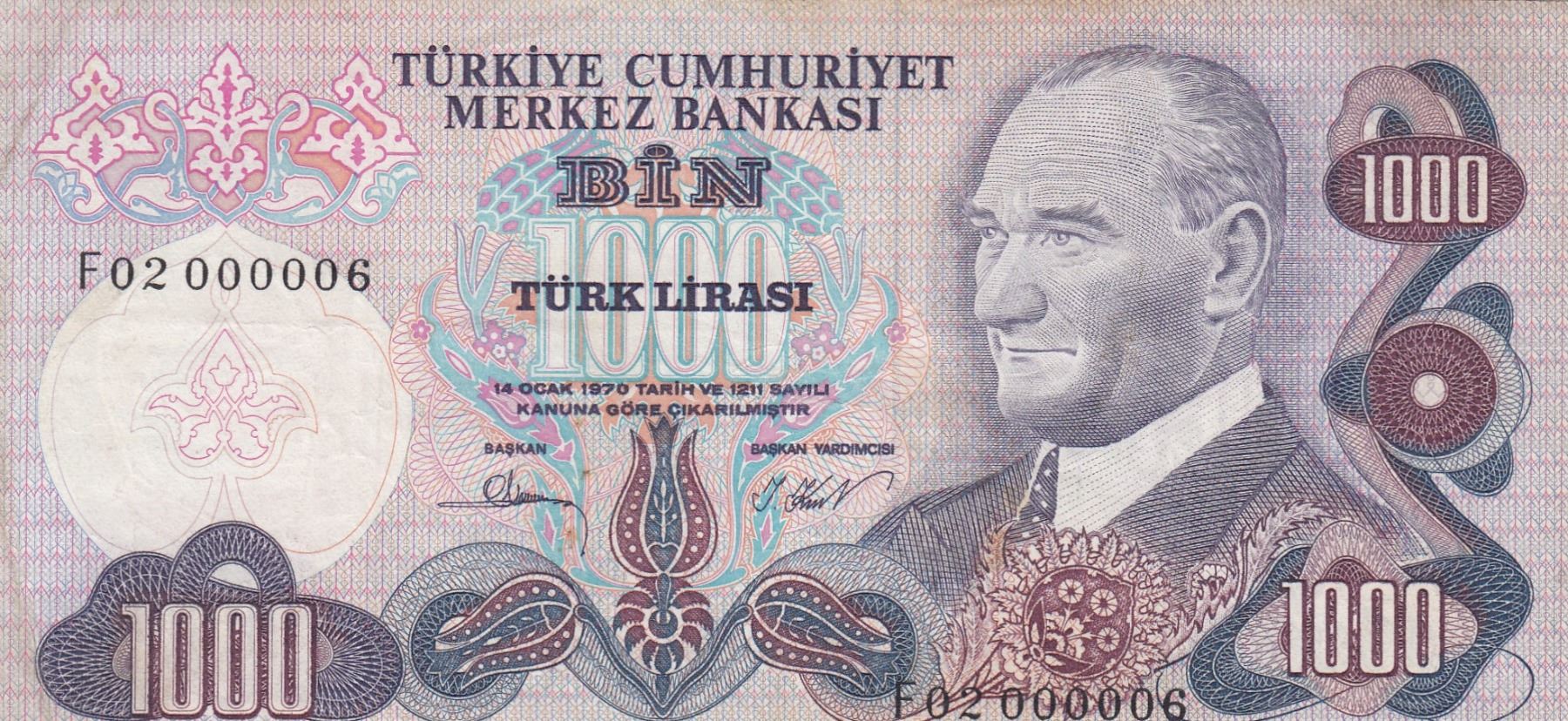 Turkey, 1.000 Lira, 1981, VF, 5/3. Emission, p191, "Very Low Serial Number"br/Atatürk portrait, serial number: F02 000006