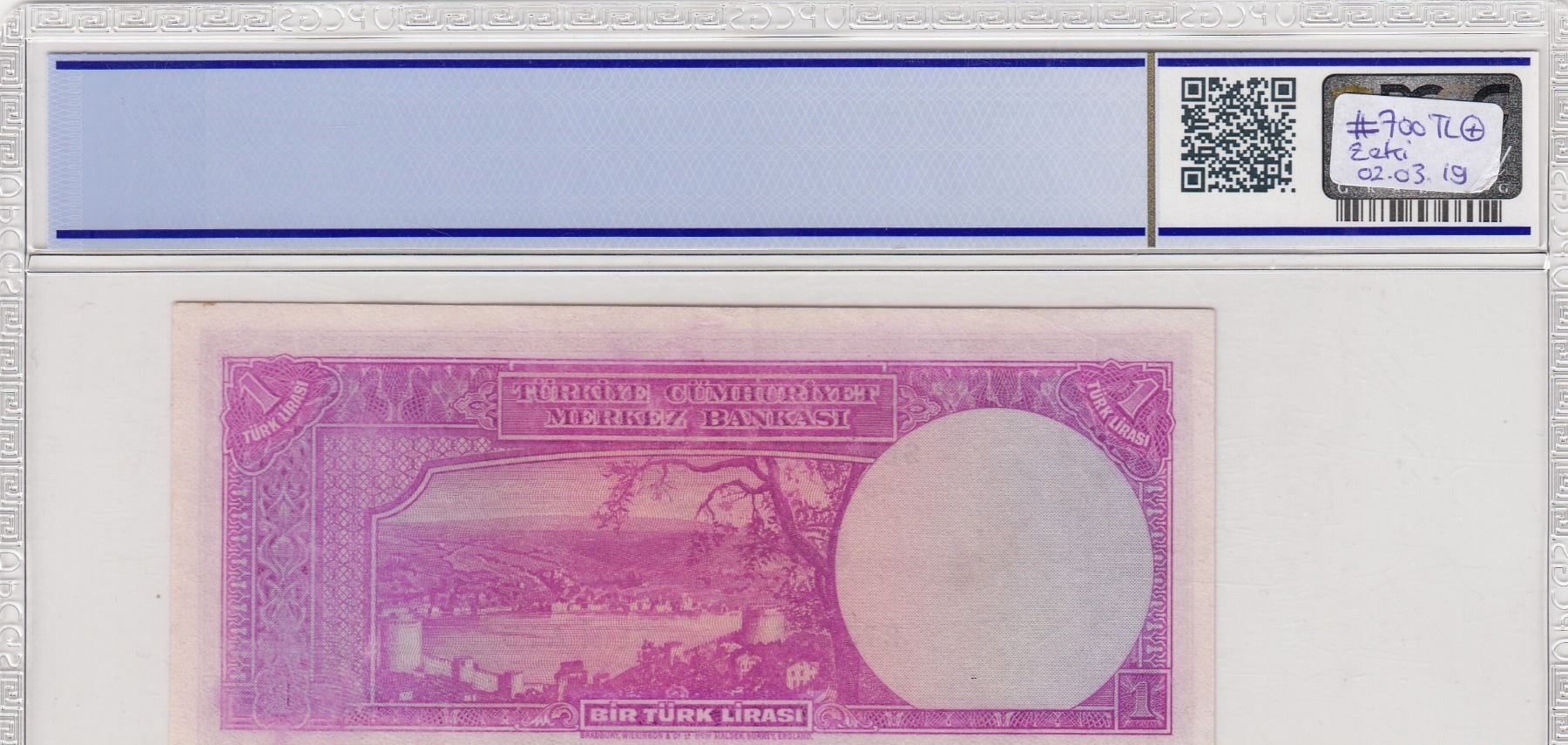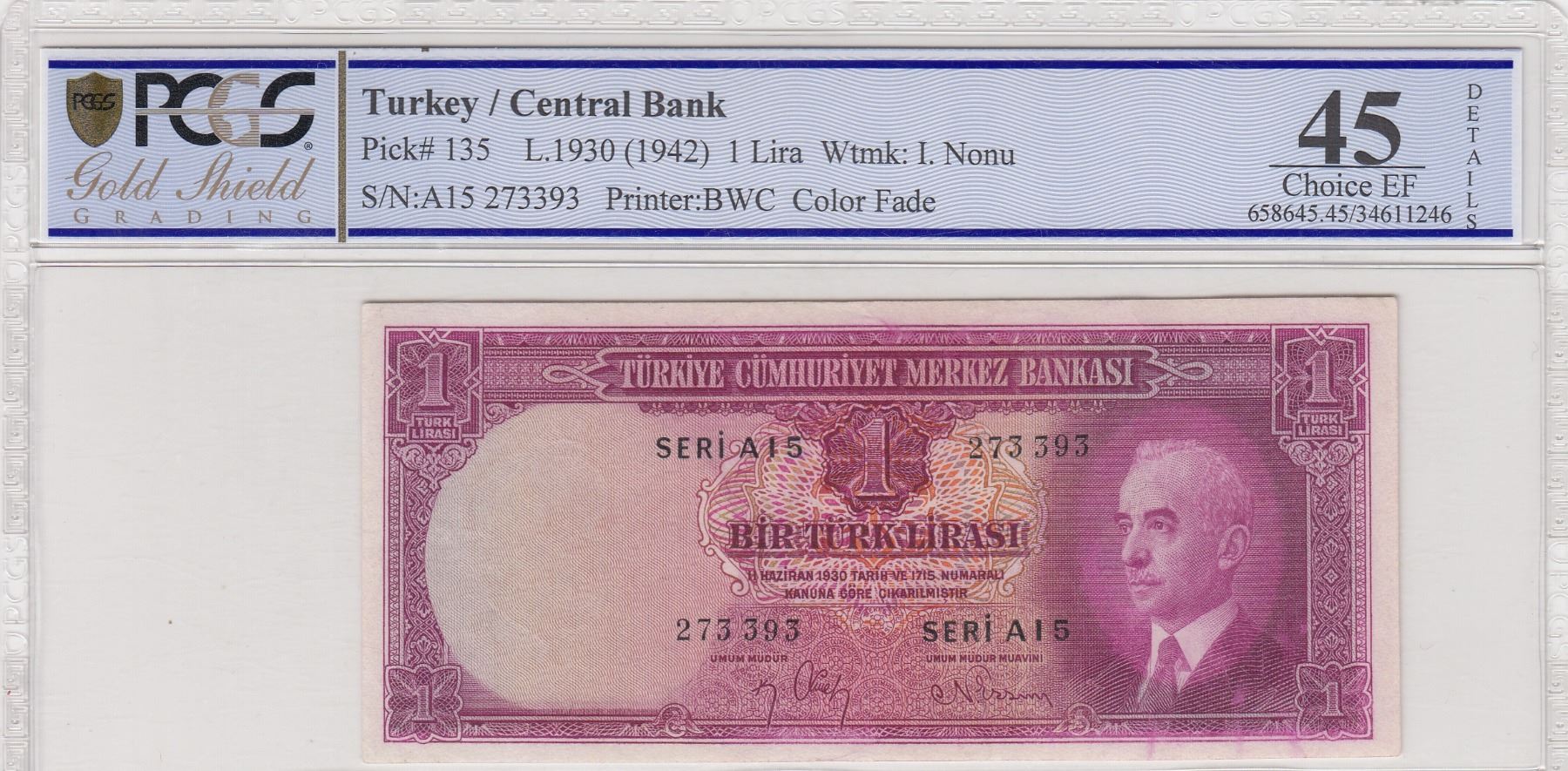 Turkey, 1 Lira, 1942, XF, p135br/PCGS 45, Inönü portrait, serial number: A15 273393