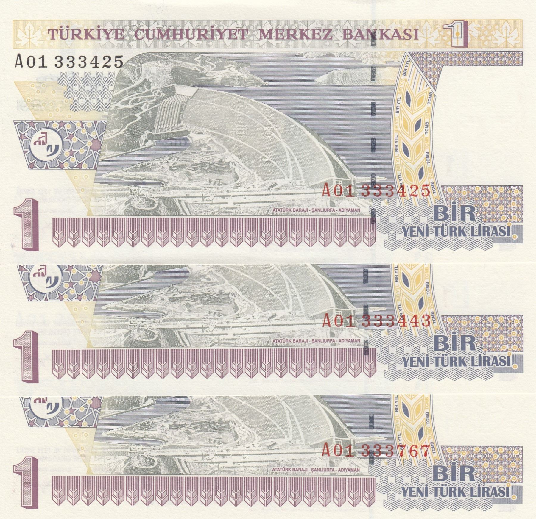 Turkey, 1 New Turkish Lira, 2005, UNC, 8/1. Emission, p216, "A01", (Total 3 banknotes)br/Atatürk portrait, serial numbers: A01 333425, A01 333443 and A01 333767