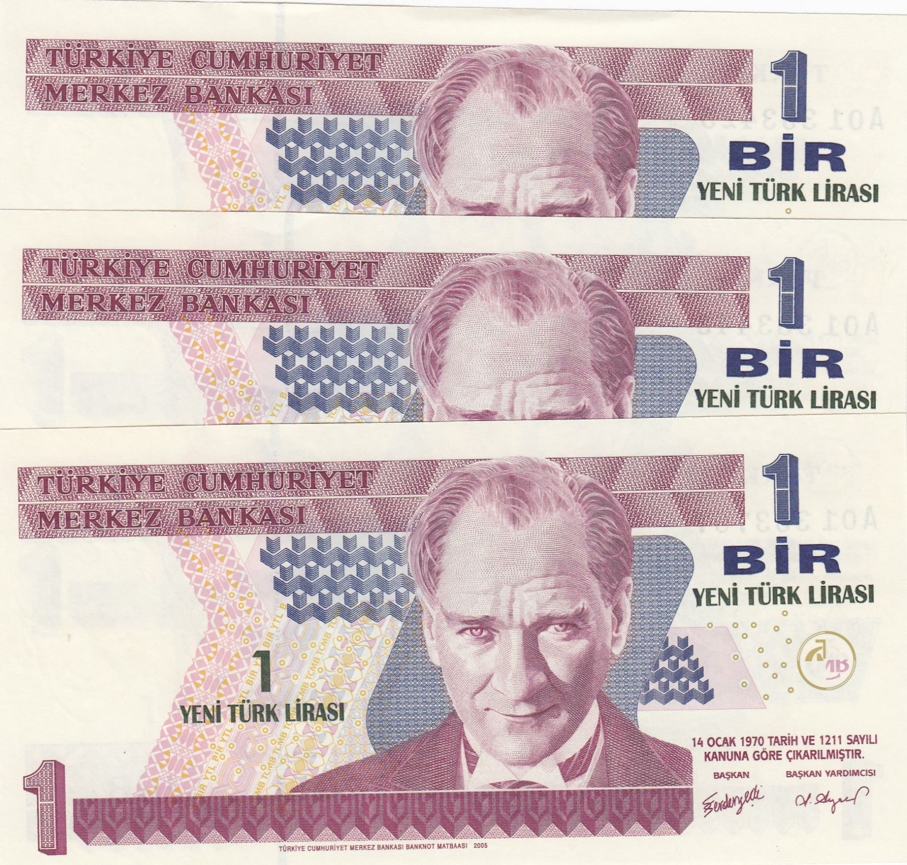 Turkey, 1 New Turkish Lira, 2005, UNC, 8/1. Emission, p216, "A01", (Total 3 banknotes)br/Atatürk por