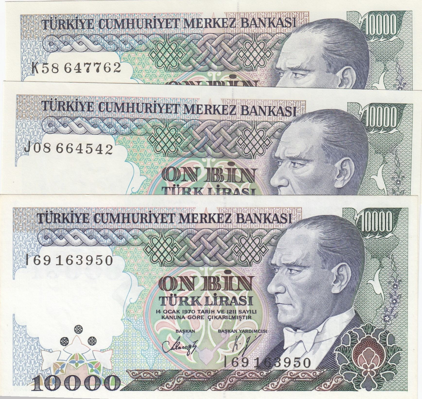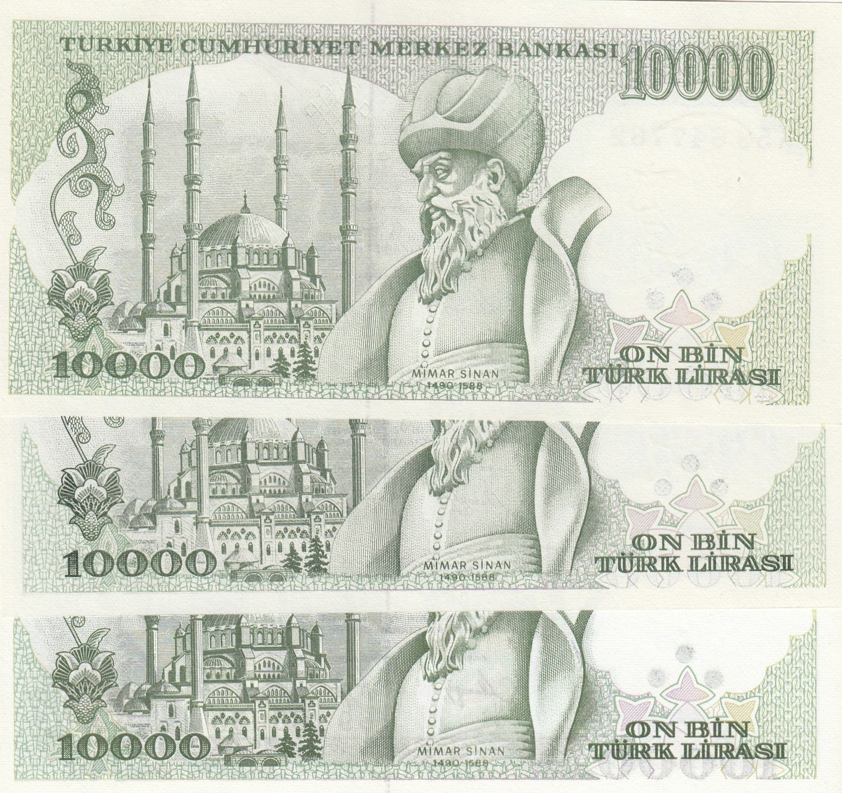 Turkey, 10.000 Lira, 1993, UNC, 7/4. Emission, p200, (Total 3 banknotes)br/serial numbers: I69 1639