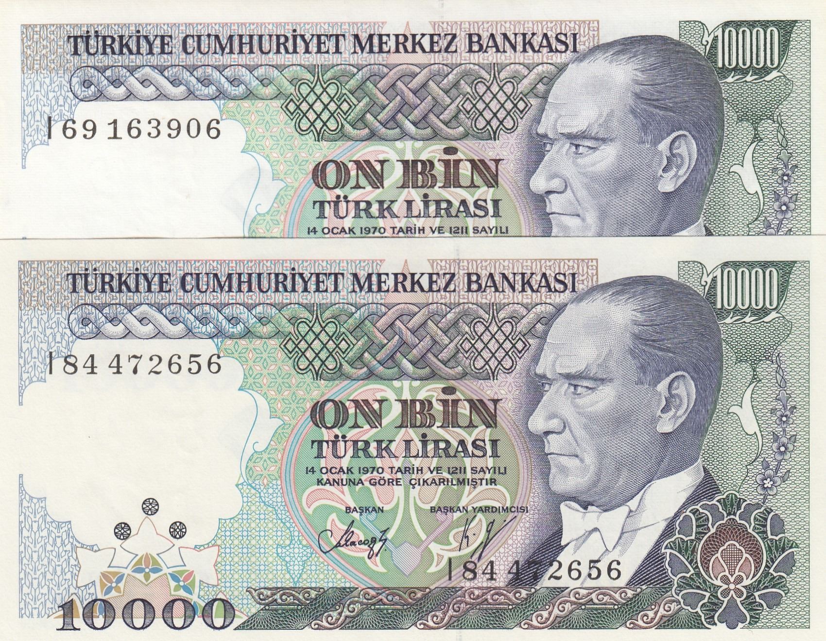 Turkey, 10.000 Lira, 1993, UNC, 7/4. Emission, p200, YELLOW AND WHITE PAPER SET, (Total 2 banknotes)br/serial numbers: I69 163906 and I84 472656