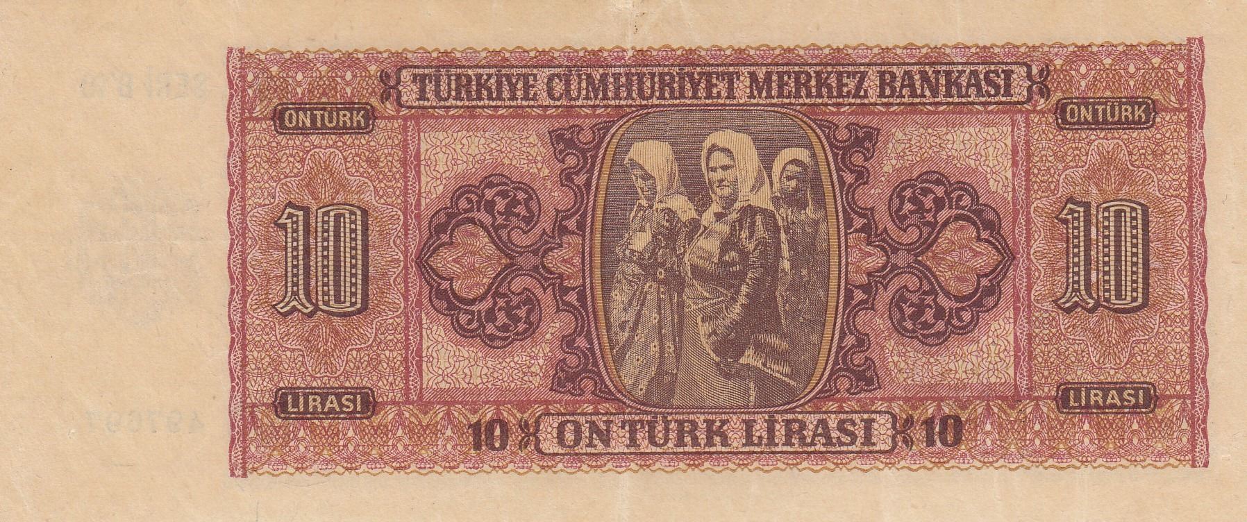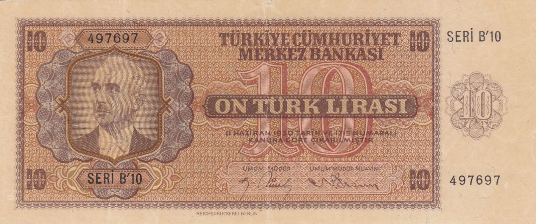 Turkey, 10 Lira, 1942, XF, 3/1. Emission, p141br/Inönü portrait, serial number: B10 497697, lightly pressed