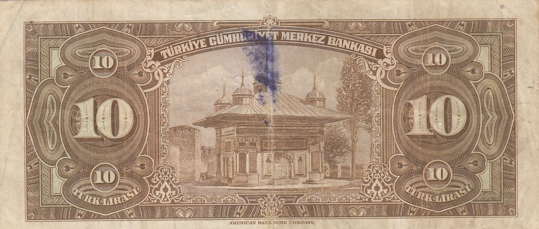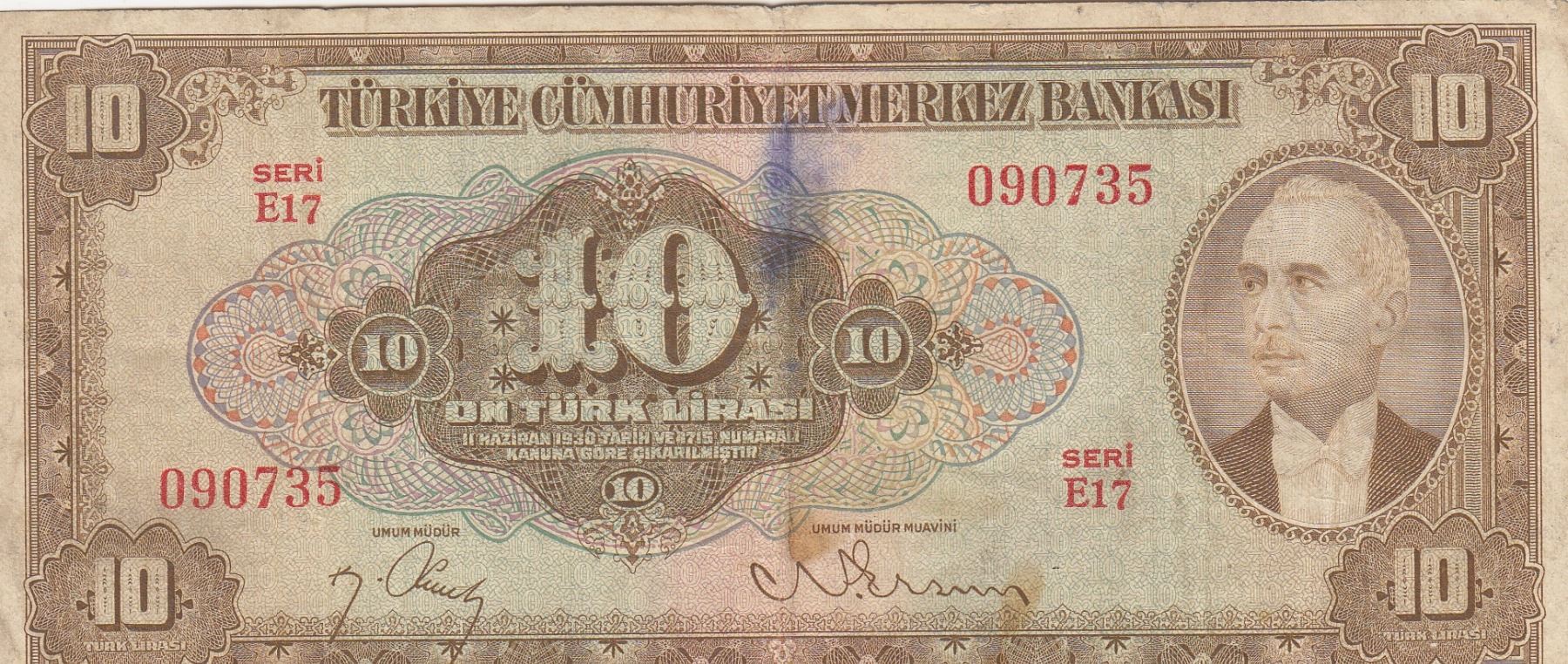 Turkey, 10 Lira, 1948, VF, p148br/natural, Inönü portrait, serial number: E17 090735