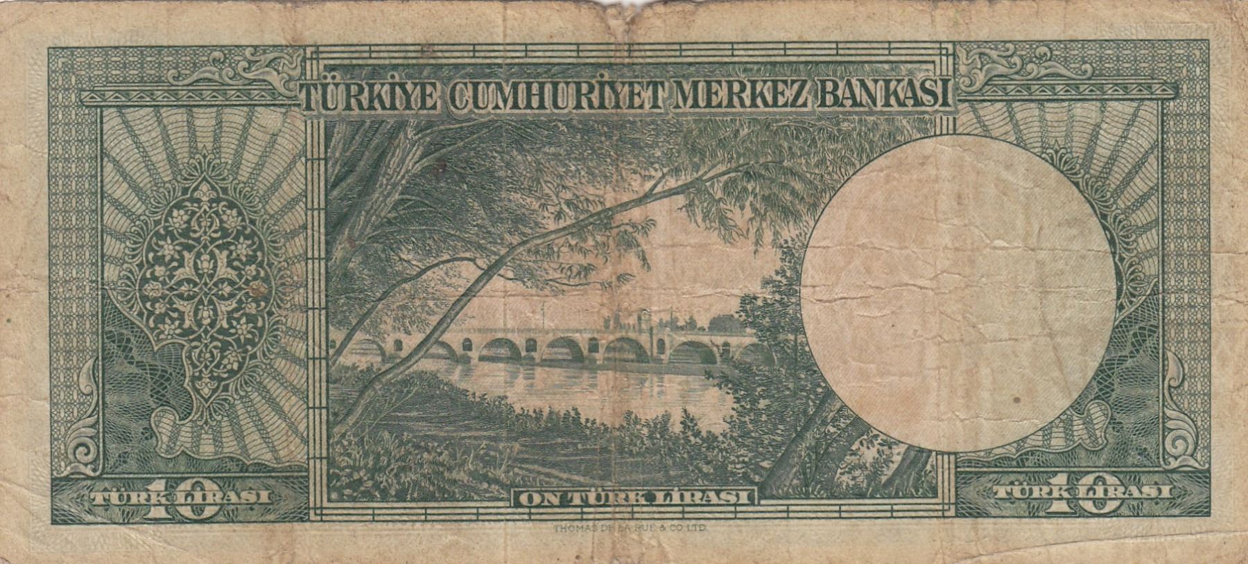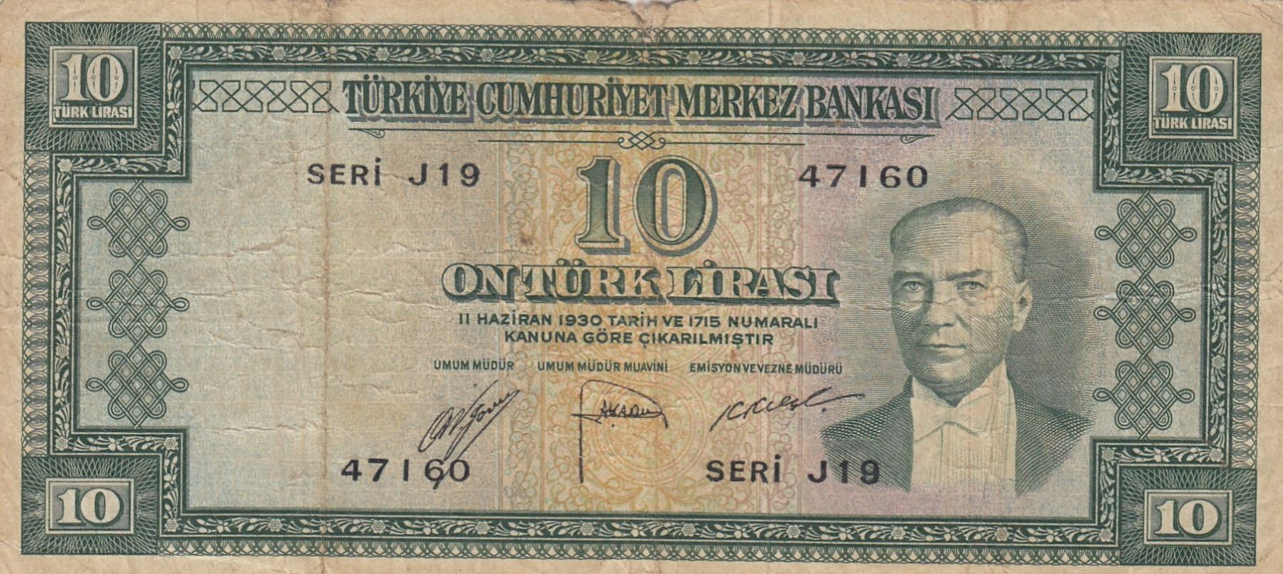 Turkey, 10 Lira, 1952, POOR, 5/1. Emission, p156br/Atatürk portrait, serial number: J19 47160