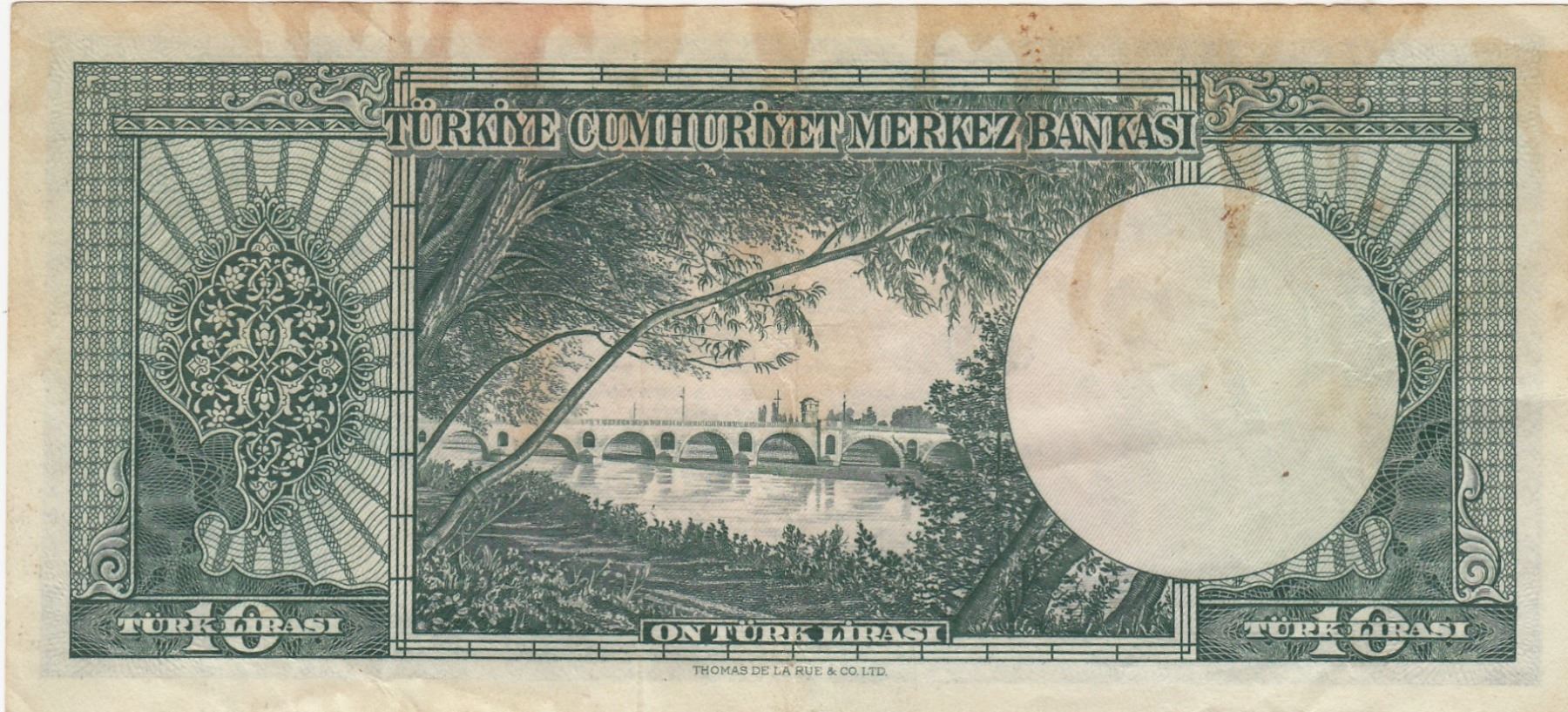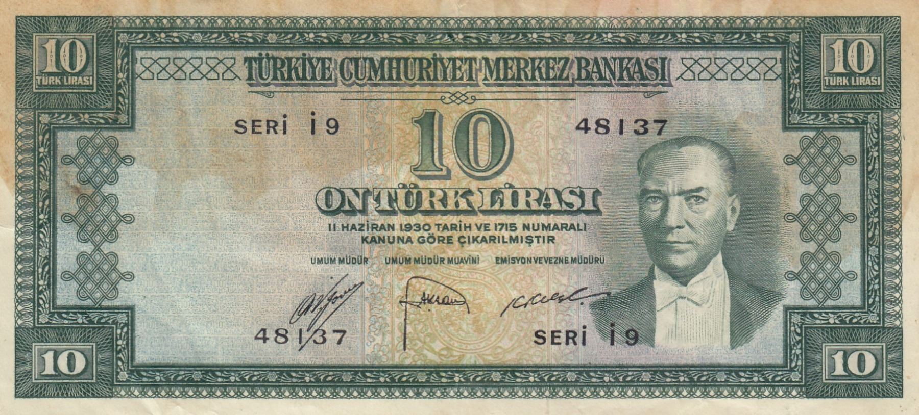 Turkey, 10 Lira, 1952, VF, 5/1. Emission, p156br/Atatürk portrait, serial number: I9 48137, there is