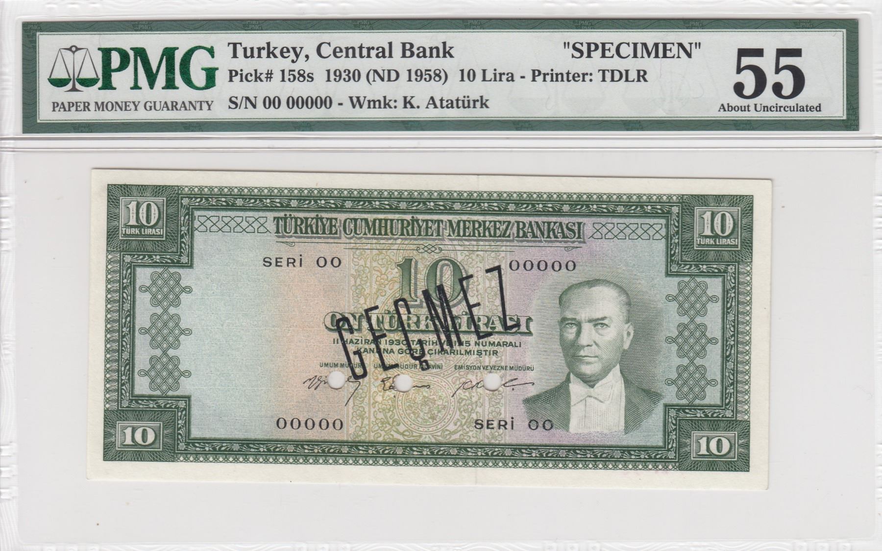 Turkey, 10 Lira, 1958, AUNC, 5/3. Emission, p158, SPECIMENbr/PMG 55, Atatürk portrait, serial number: 00 00000
