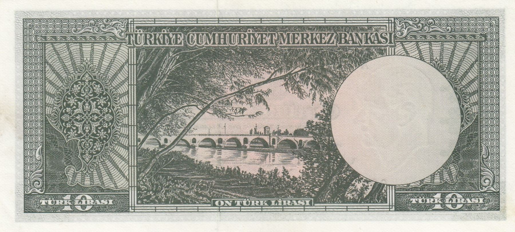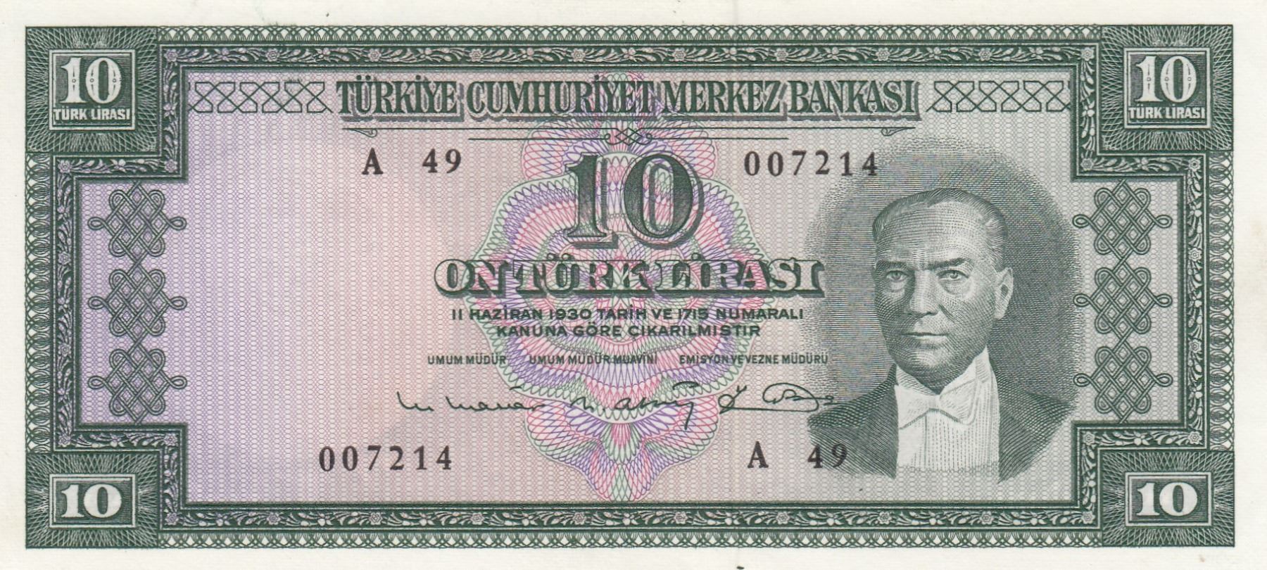 Turkey, 10 Lira, 1963, AUNC, 5/6. Emission, p161br/Atatürk portrait, serial number: A49 007214