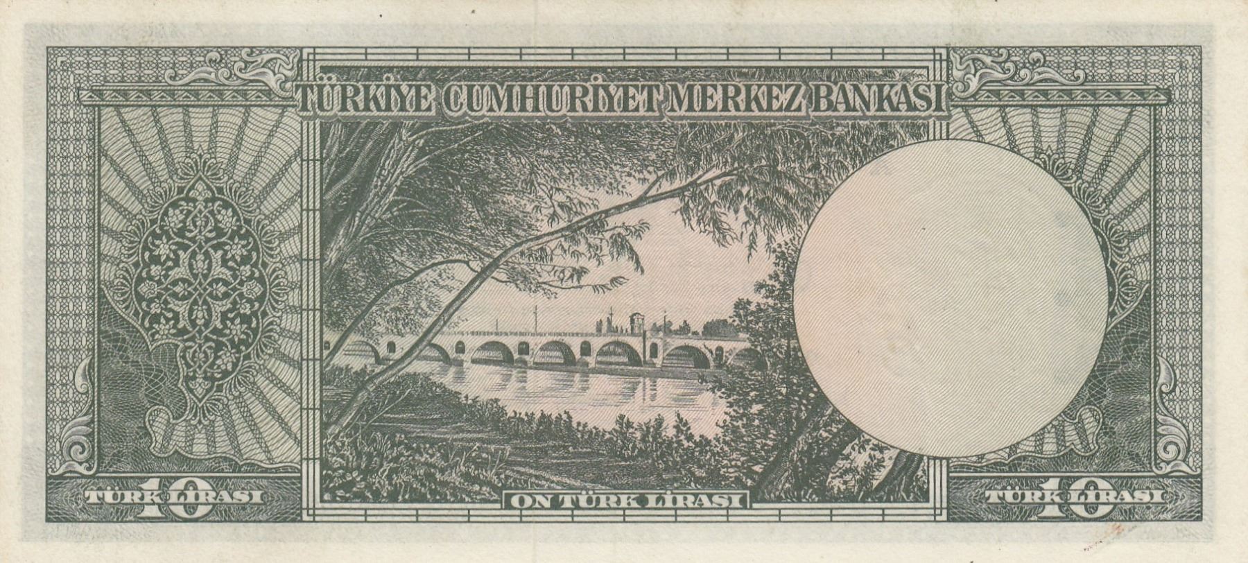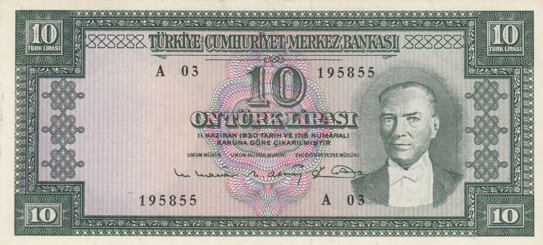 Turkey, 10 Lira, 1963, XF, p161br/Atatürk portrait, serial number: A03 195855, lightly pressed