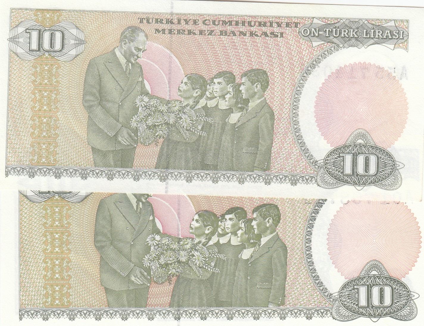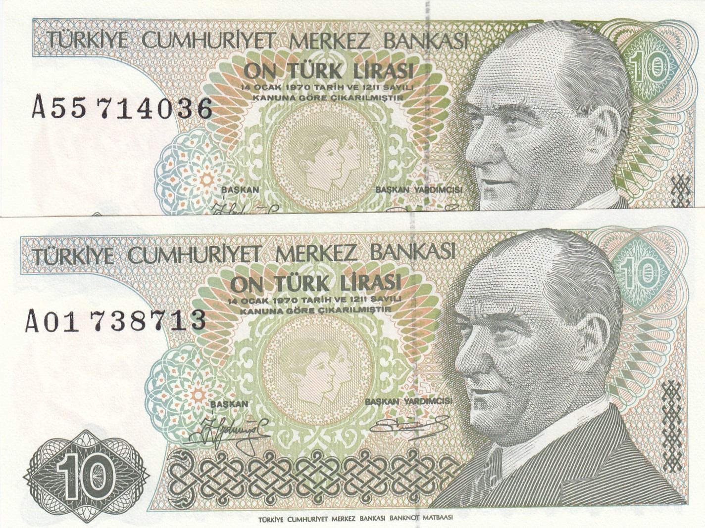 Turkey, 10 Lira, 1966, UNC, 6/1. Emission, p180, "A01" first prefix and "A55" last prefix, (Total 2 banknotes)br/serial numbers: A01 738713 and A55 714036