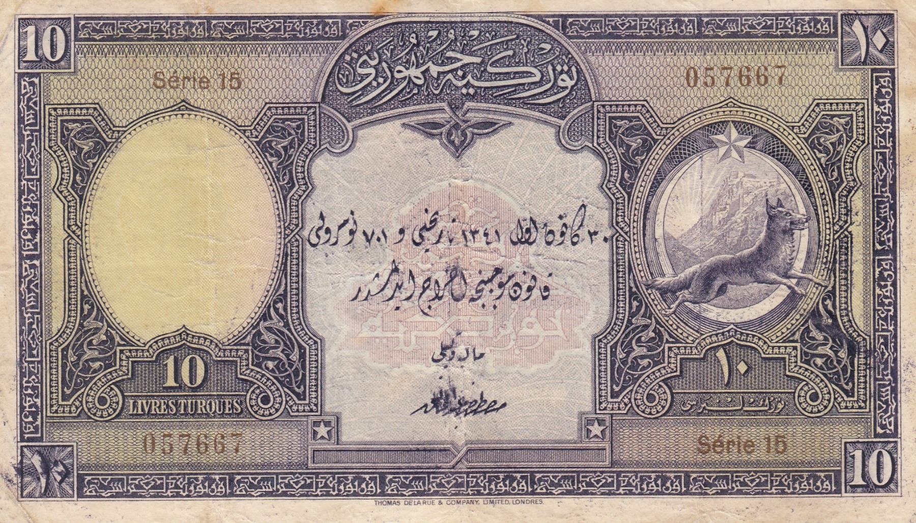 Turkey, 10 Livre, 1927, XF (-), 1/1. Emission, p121br/serial number: 15 057667, natural