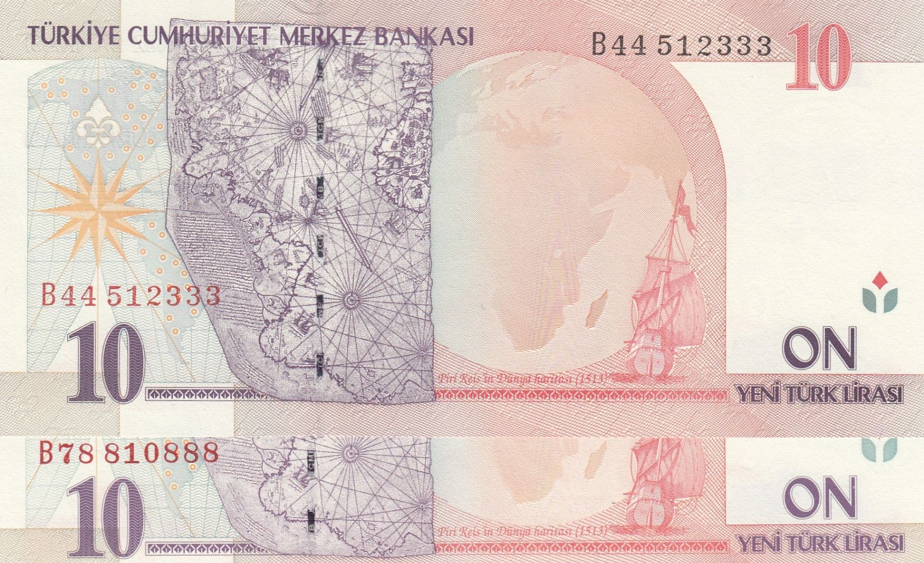 Turkey, 10 New Turkish Lira, 2005, UNC, 8. Emission, p218, (Total 2 banknotes)br/Atatürk portrait, serial numbers: B44 512333 and B78 810888