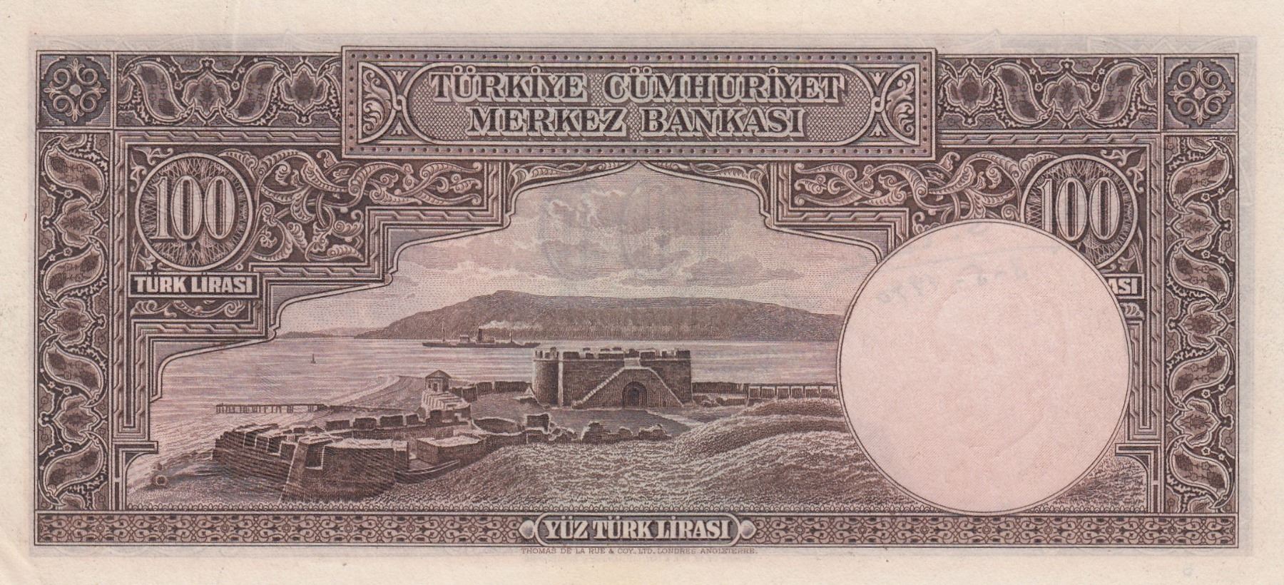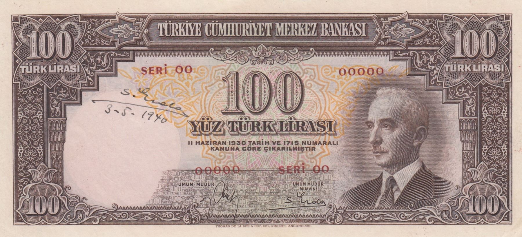 Turkey, 100 Lira, 1938, UNC, 2/1. Emission, p130, SPECIMENbr/Inönü portrait, serial number: 00 00000, Deputy Governor of Central Bank Said Erda has wet signature