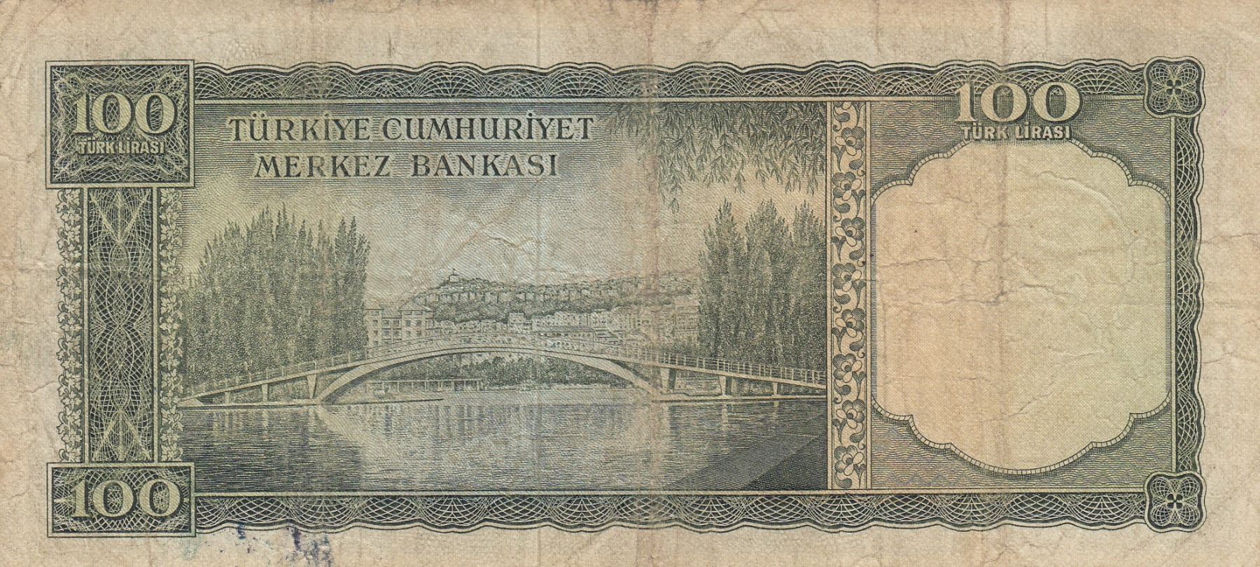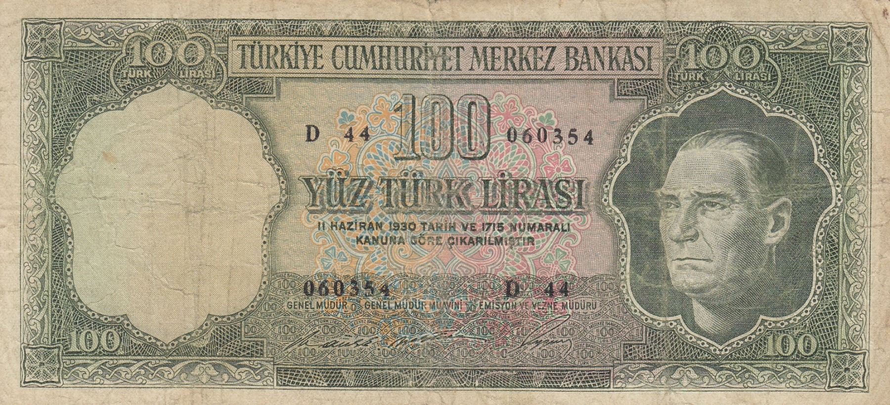 Turkey, 100 Lira, 1969, FINE (-), 5/5. Emission, p182br/Atatürk portrait, serial number: D44 060354