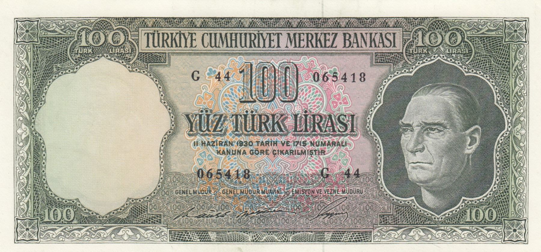 Turkey ,100 Lira, 1969, UNC, 5/6. Emission, p182br/Atatürk portrait, serial number: G44 065418