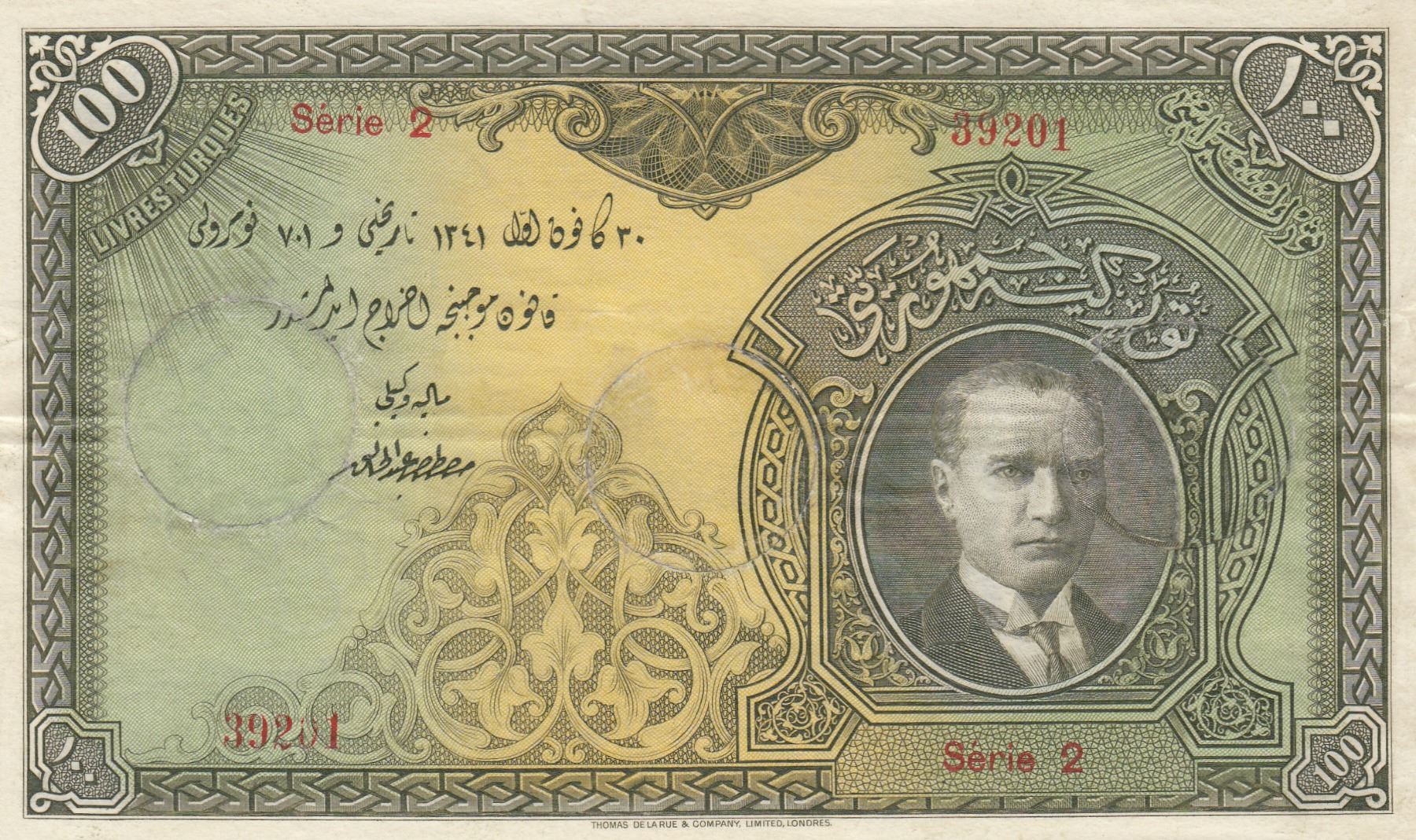 Turkey, 100 Livre, 1927, UNC, 1/1. Emission, p123, CANCELLATION HOLES FILLEDbr/serial number: 2 3920