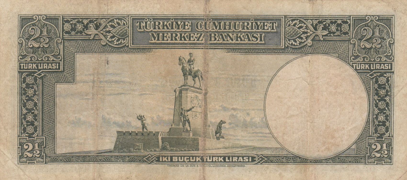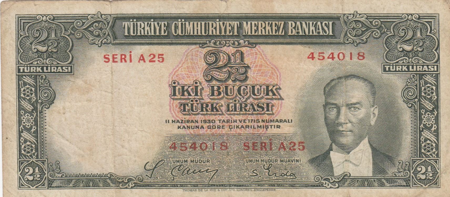 Turkey, 2 1/2 Lira, 1939, FINE, 2/1. Emission, p126br/Atatürk portrait, serial number: A25 454018