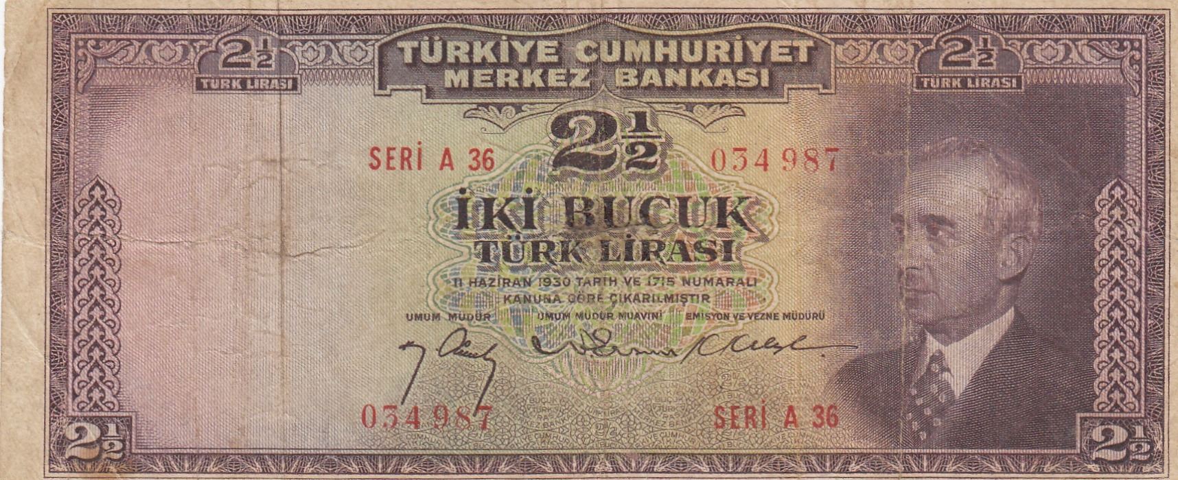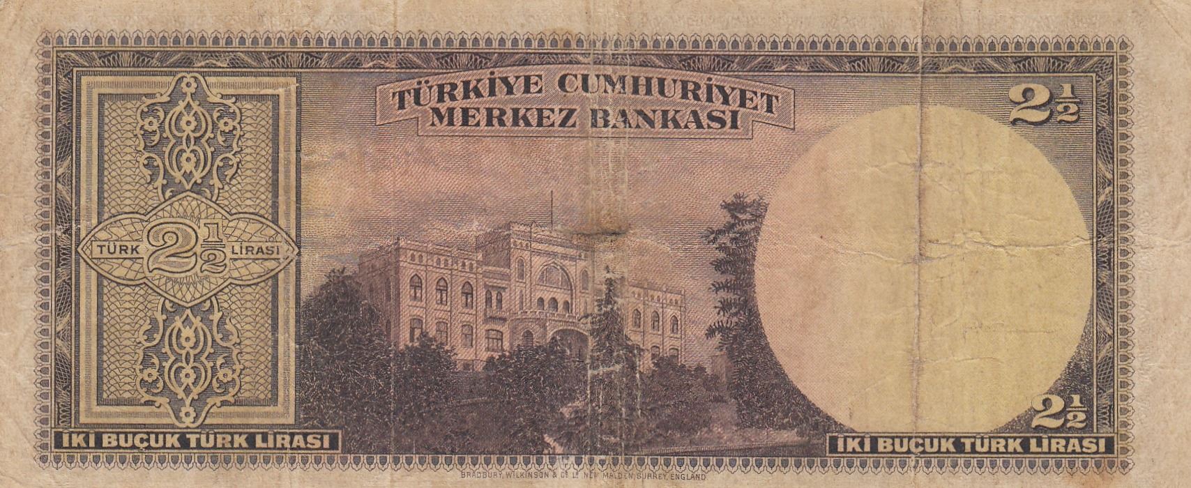 Turkey, 2 1/2 Lira, 1947, FINE, 3/1. Emission, p140br/serial number: A36 034987
