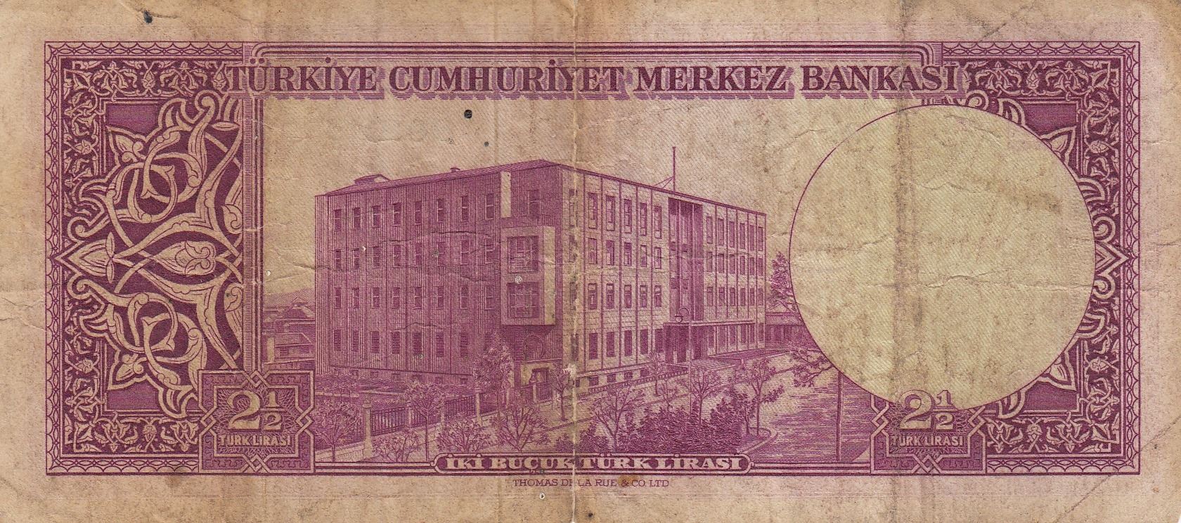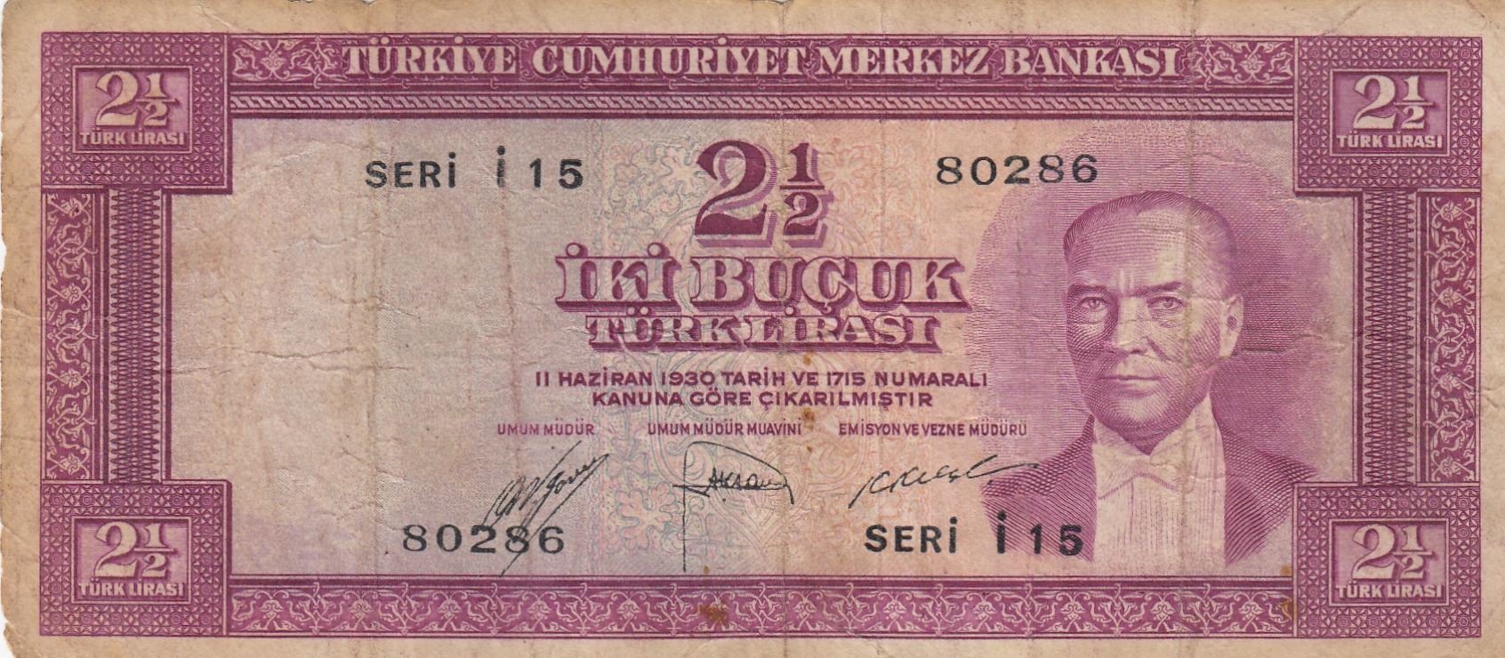 Turkey, 2 1/2 Lira, 1952, FINE, 5/1. Emission, p150br/serial number: I15 80286