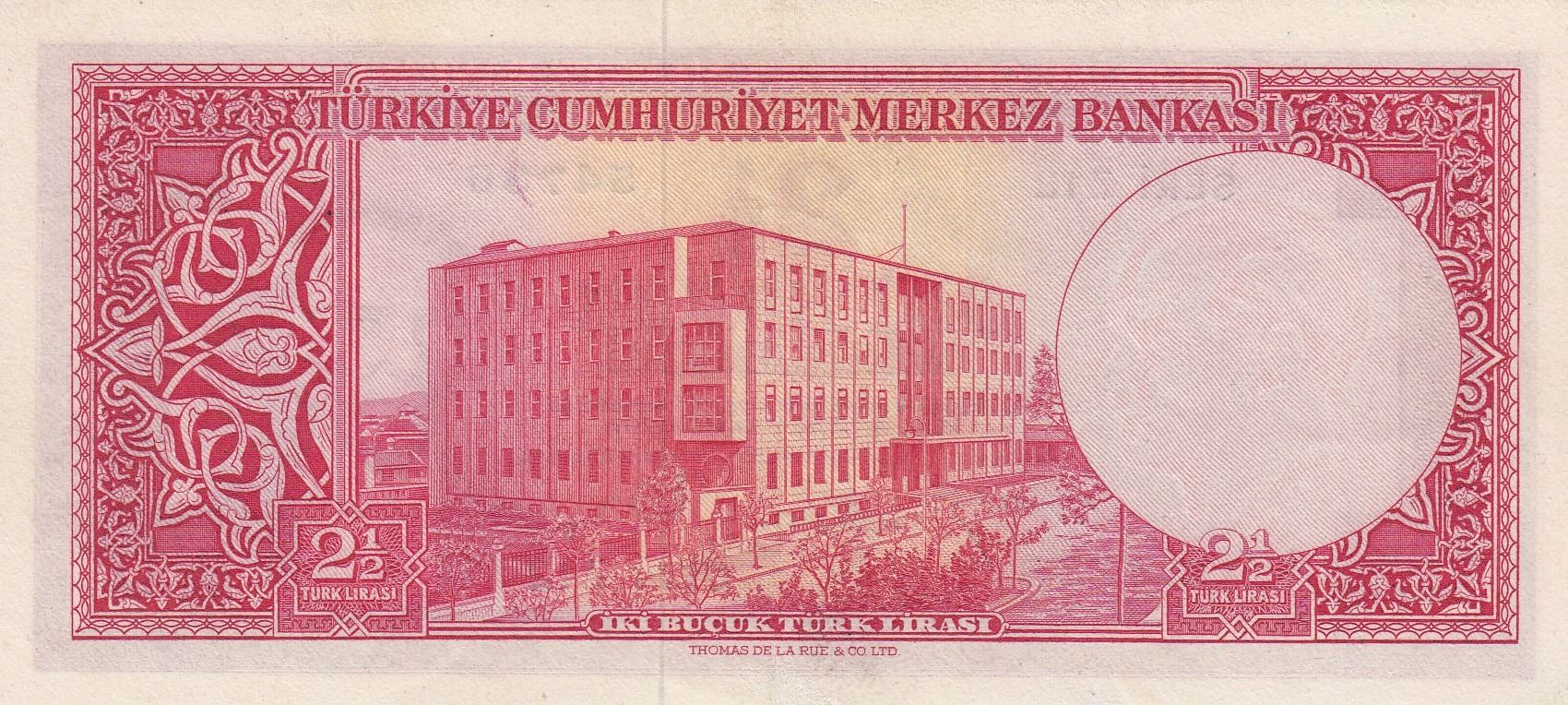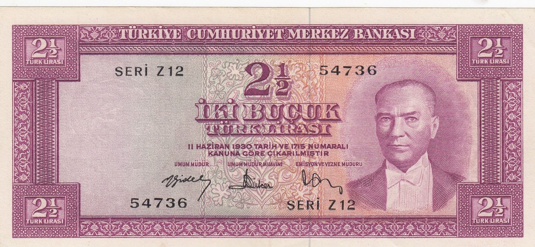 Turkey, 2 1/2 Lira, 1957, AUNC, 5/3. Emission, p152br/Atatürk portrait, serial number: Z12 54736