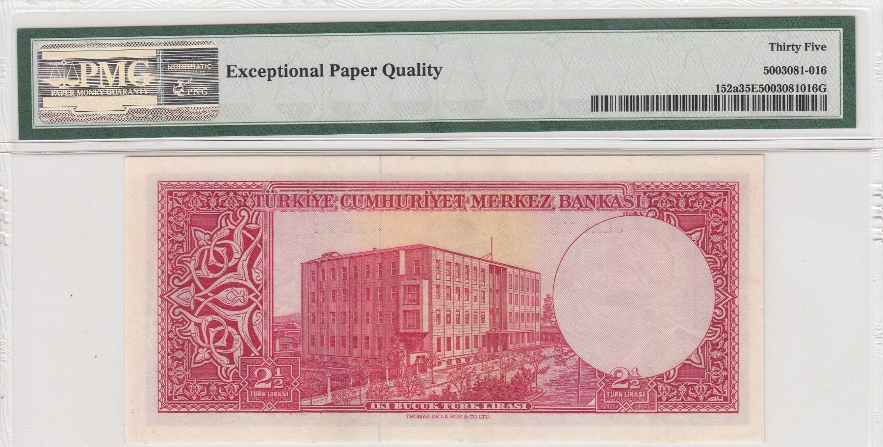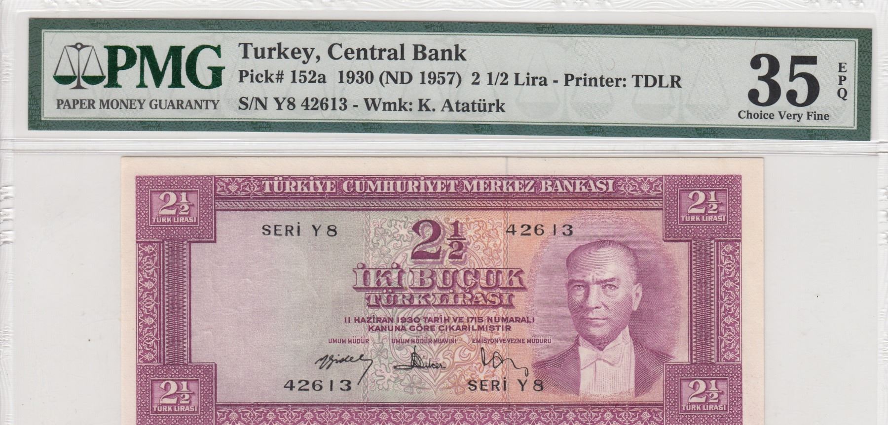 Turkey, 2 1/2 Lira, 1957, VF, p152br/PMG 35 EPQ, Atatürk portrait, serial number: Y8 42613