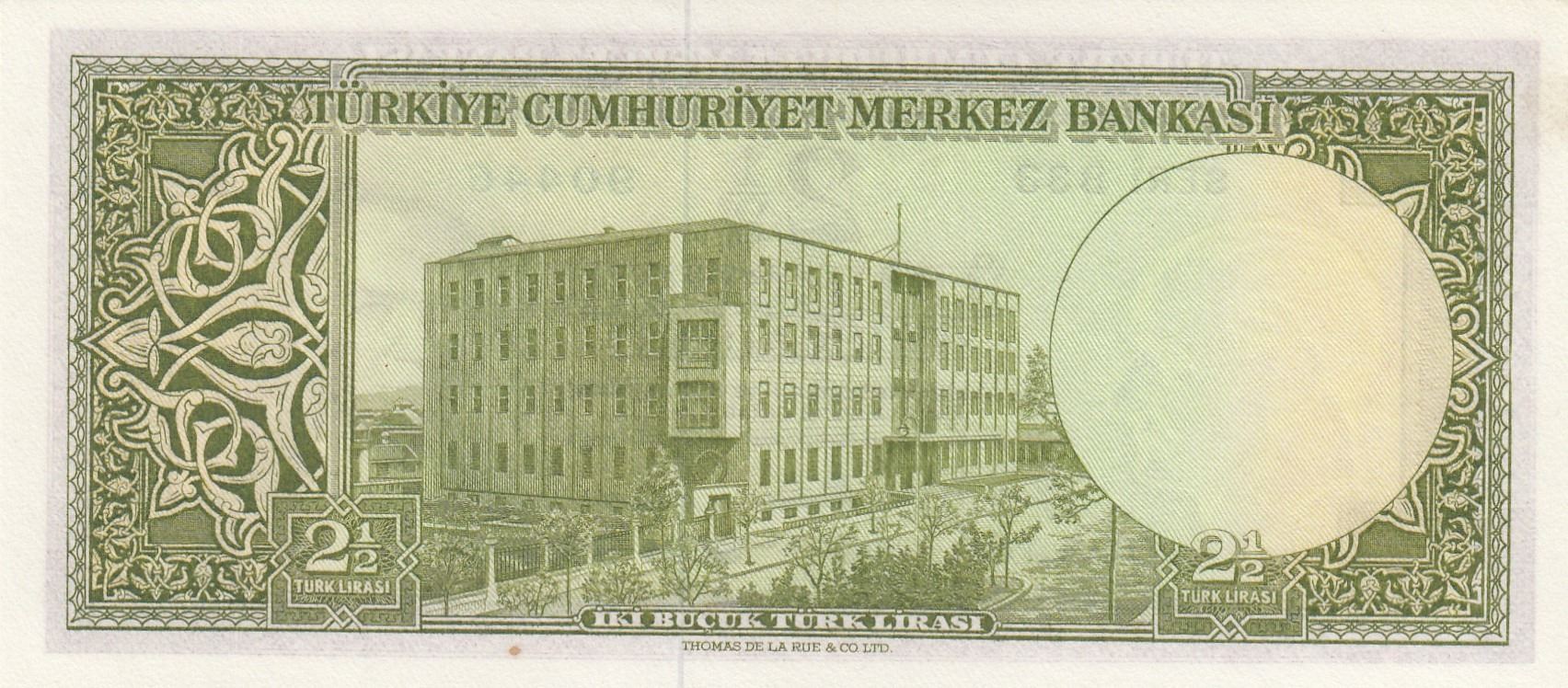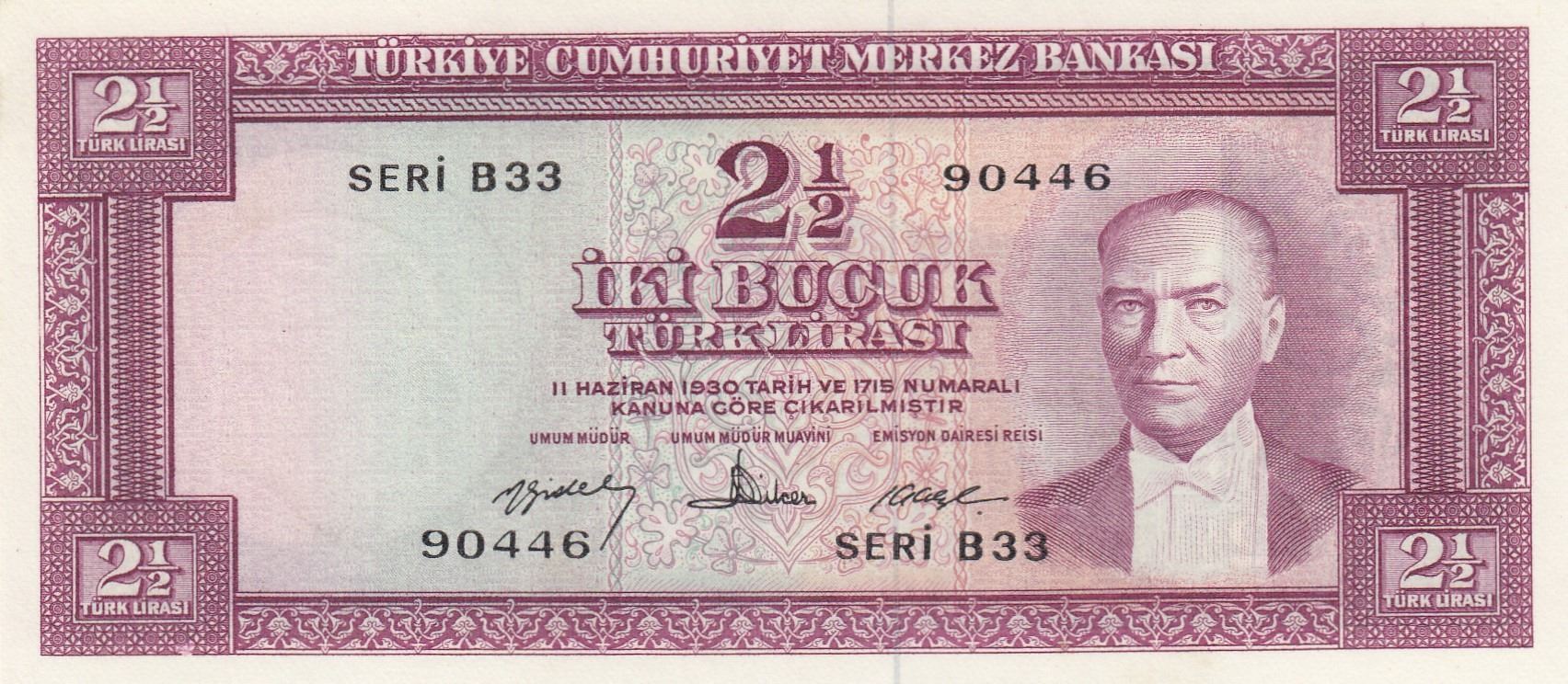 Turkey, 2 1/2 Lira, 1960, UNC, 5/4. Emission, p153br/Atatürk portrait, serial number: B33 90446