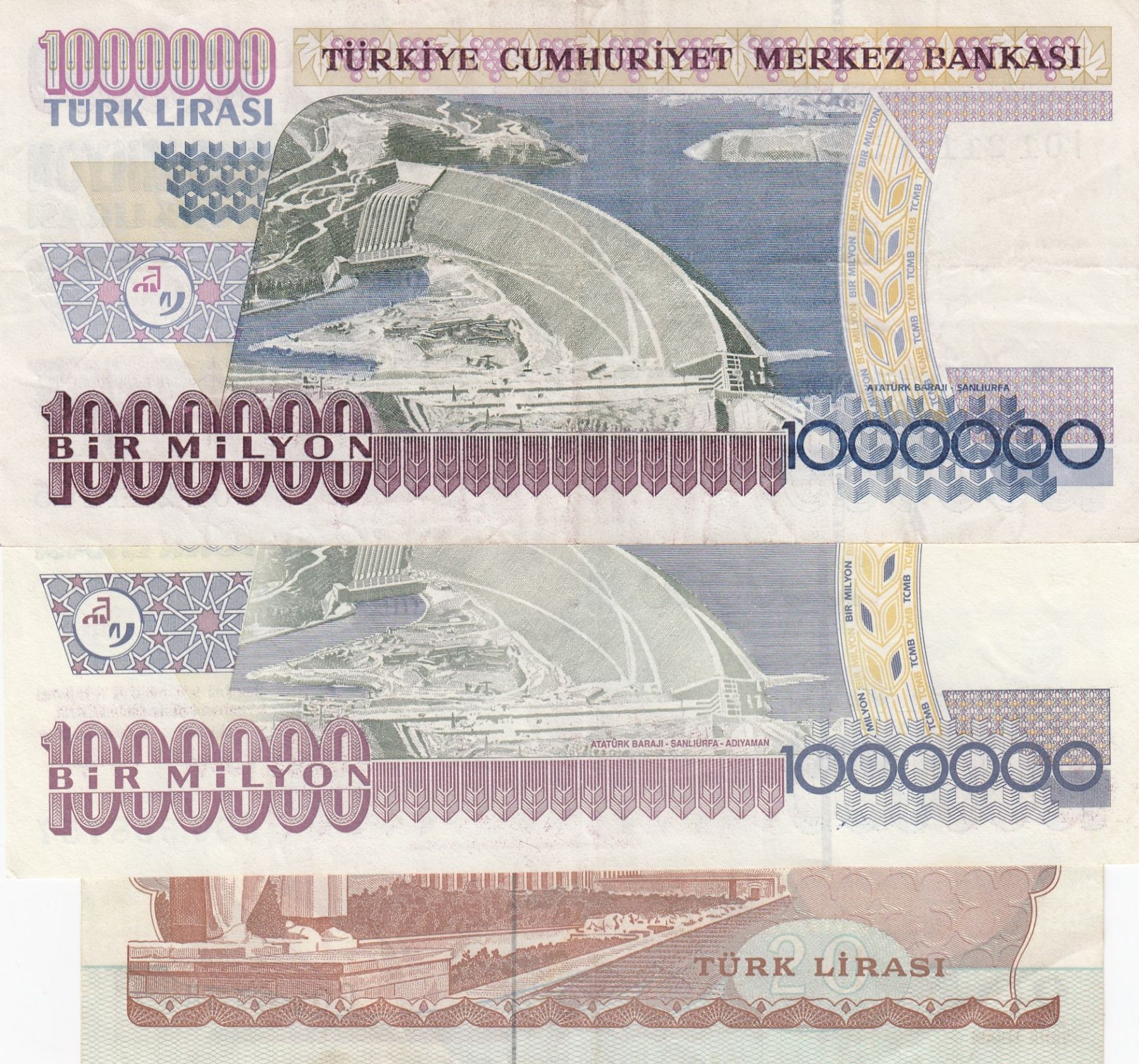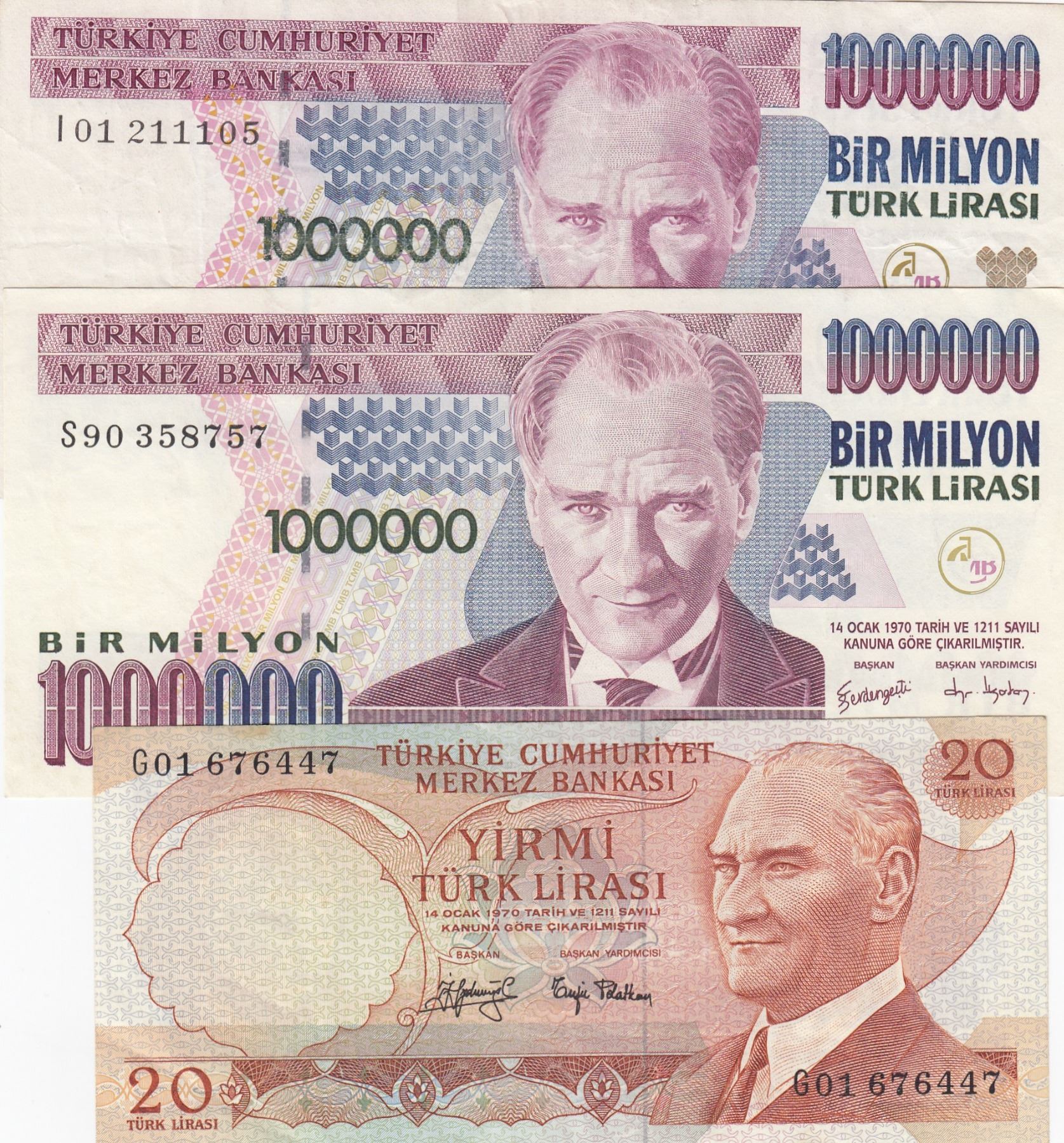 Turkey, 20 Lira and 1.000.000 Lira (2), 1979/2002, VF/XF, 6. and 7. Emission, p187, p209c, (Total 3 banknotes)br/prefix numbers: G01, I01 and S90