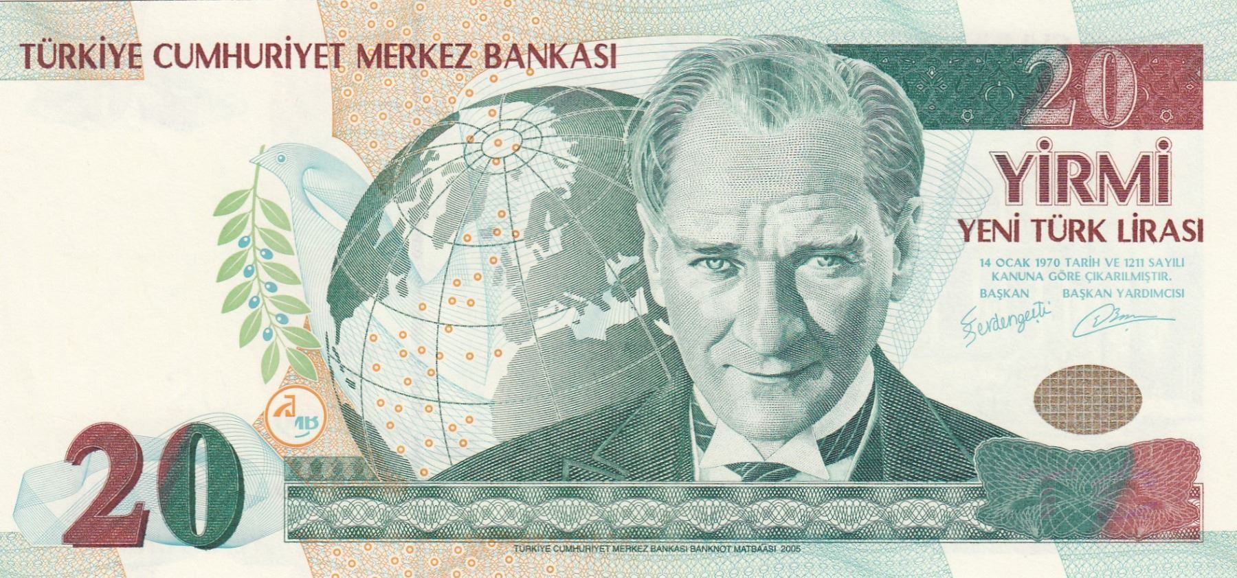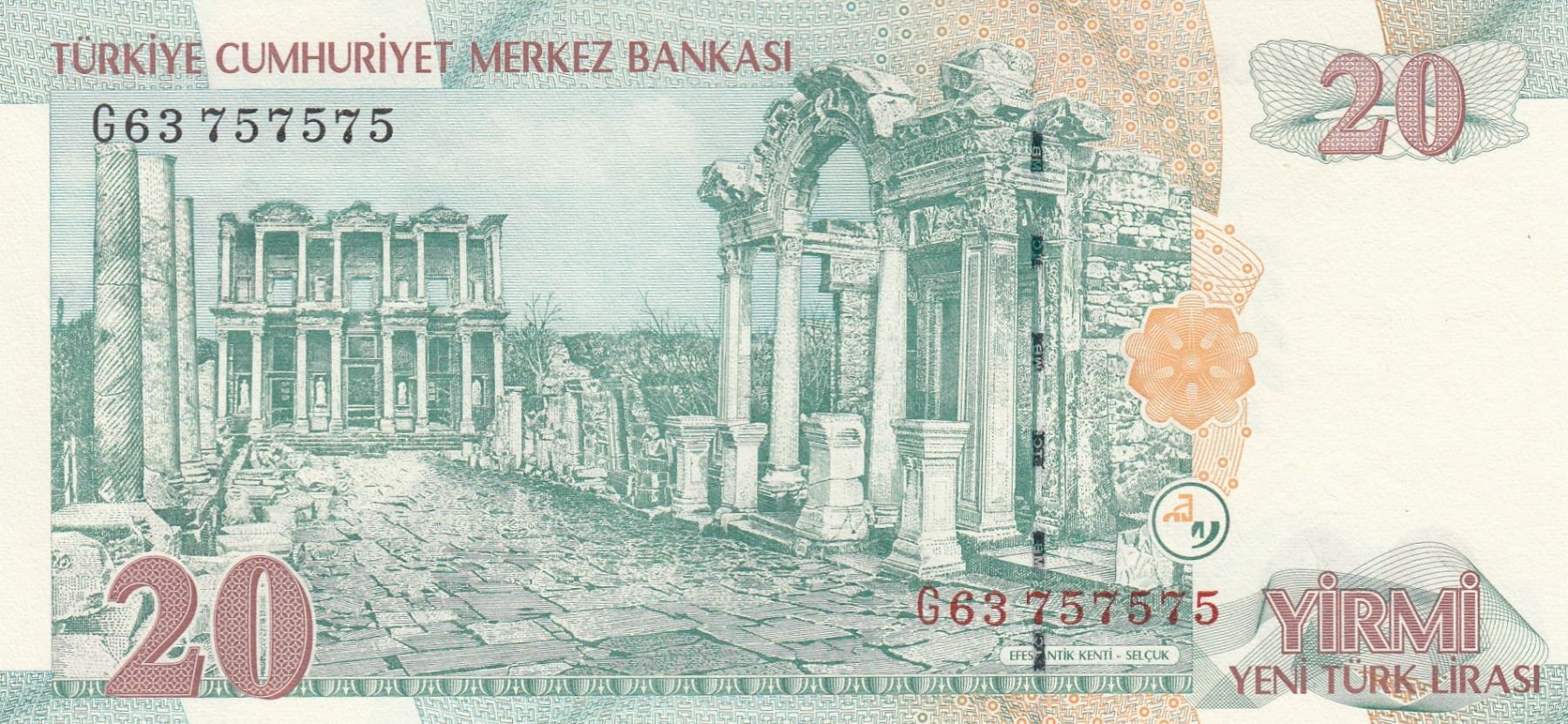 Turkey, 20 New Turkish Lira, 2005, UNC, 8. Emission, p219, "Nice Number"br/Atatürk portrait, serial number: G63 757575