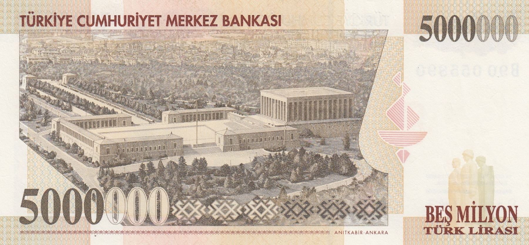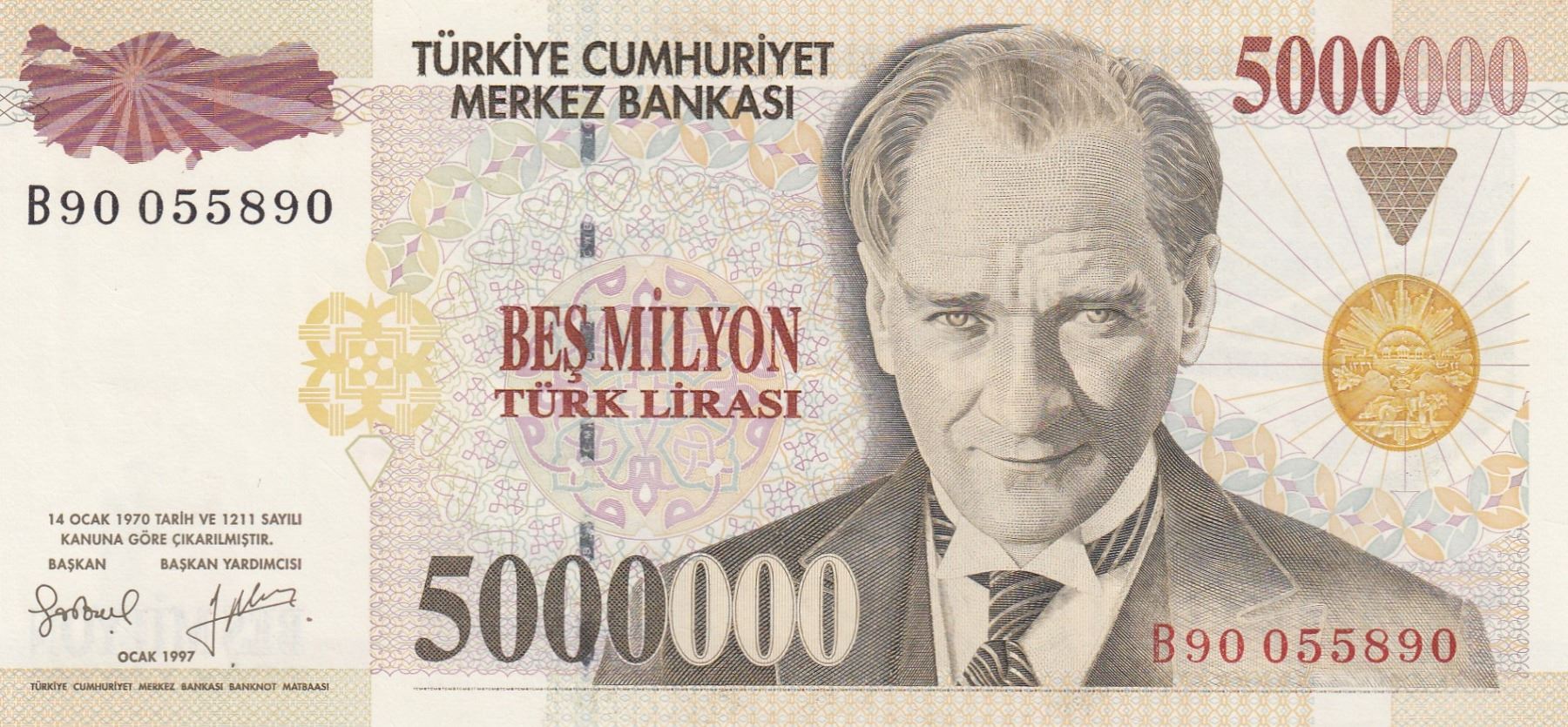 Turkey, 5.000.000 Lira, 1997, UNC, 7/1. Emission, p210a, "B90"br/Atatürk portrait, serial number: B90 0890