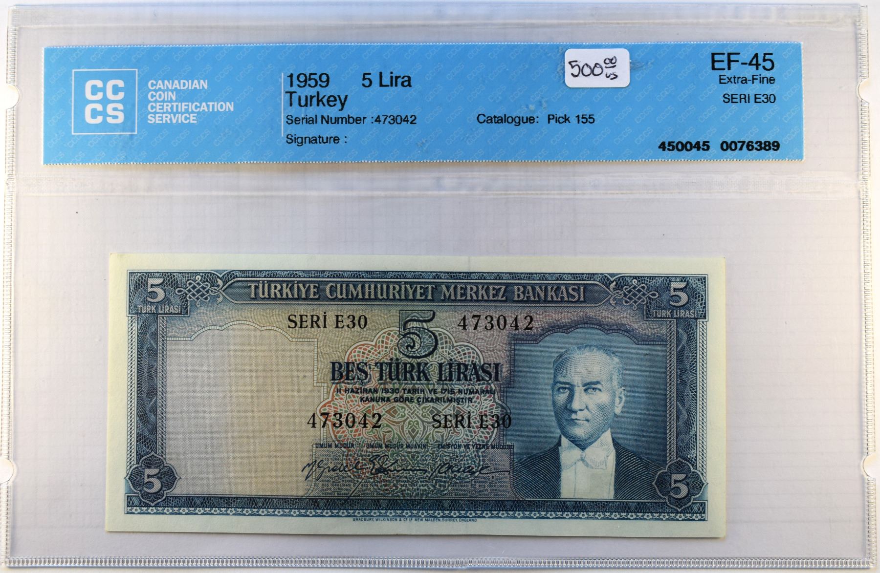 Turkey, 5 Lira 1930 (1959) Pick 155 XF-45 Certified CCCS