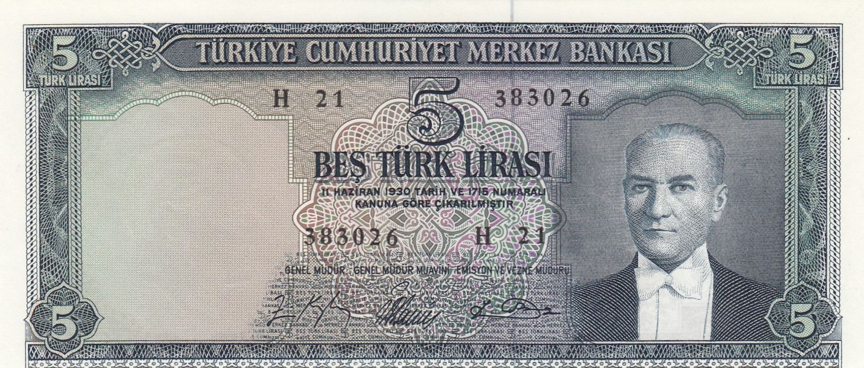 Turkey, 5 Lira, 1965, UNC, 5/4. Emission, p174br/Atatürk portrait, serial number: H21 383026